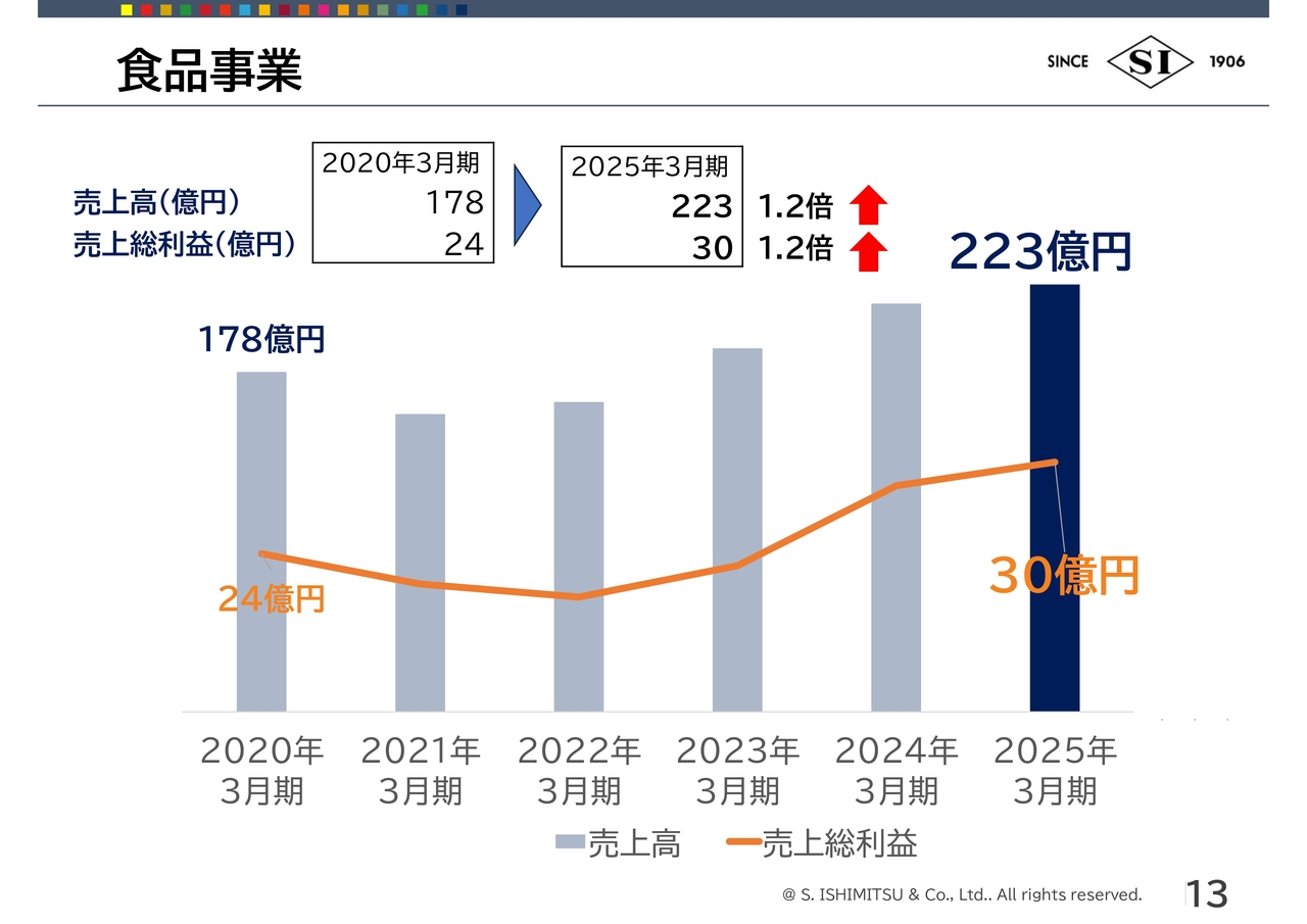 荒川:食品事業です。売上高は2020年3月期比で1.2倍の223億円、売上総利益は1.2倍の30億円となりました。