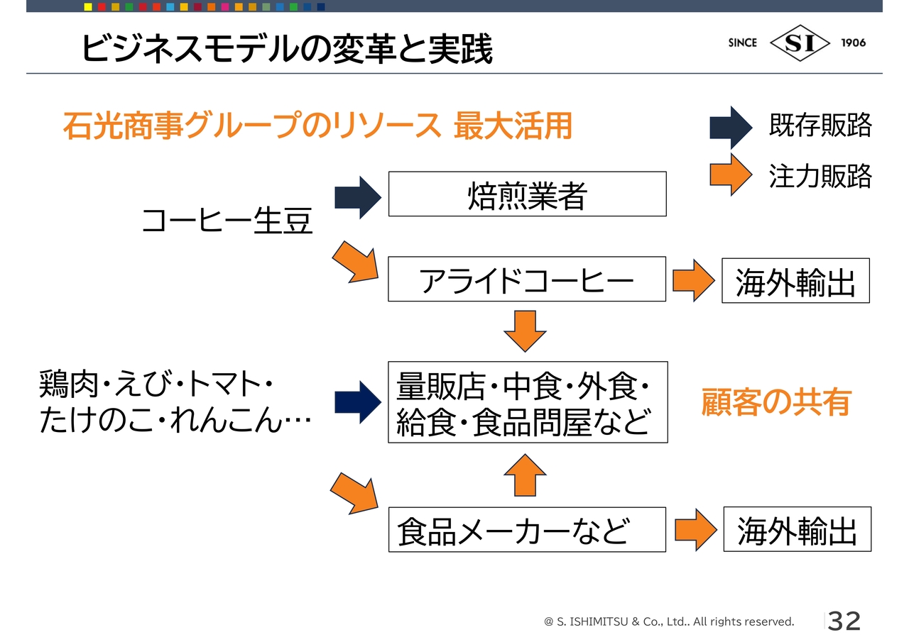 例えば、コーヒーの生豆は焙煎業者がメインのお客さまでしたが、グループ会社のアライドコーヒーロースターズで製品に仕上げて海外に輸出展開したり、食品事業のお客さまである量販店、中食・外食業者などにアライドコーヒーロースターズで作り上げた商品を展開することで、顧客の共有を図ったりしていきたいと考えています。