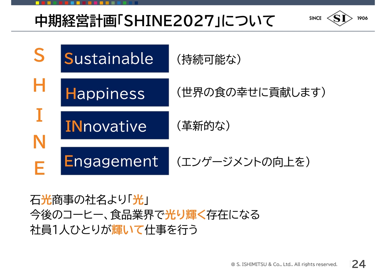 荒川:中期経営計画「SHINE2027」についてご説明します。計画名の「SHINE」は、「Sustainable」「Happiness」「INnovative」「Engagement」の頭文字をとっています。