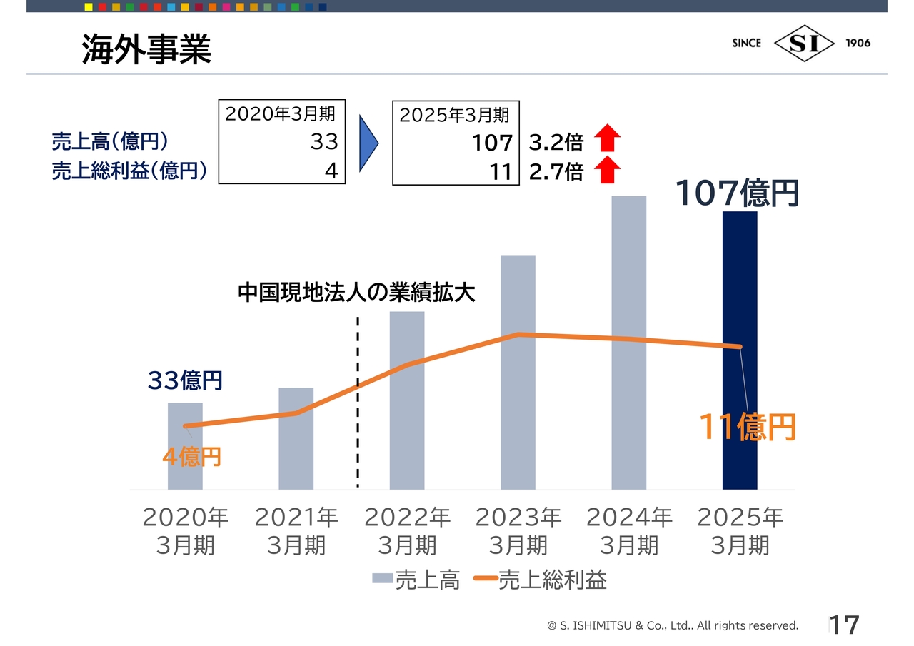 荒川:海外事業です。2020年3月期に売上高33億円、売上総利益4億円だったものが、2025年3月期は売上高が3.2倍の107億円、売上総利益が2.7倍の11億円と大きく飛躍しています。