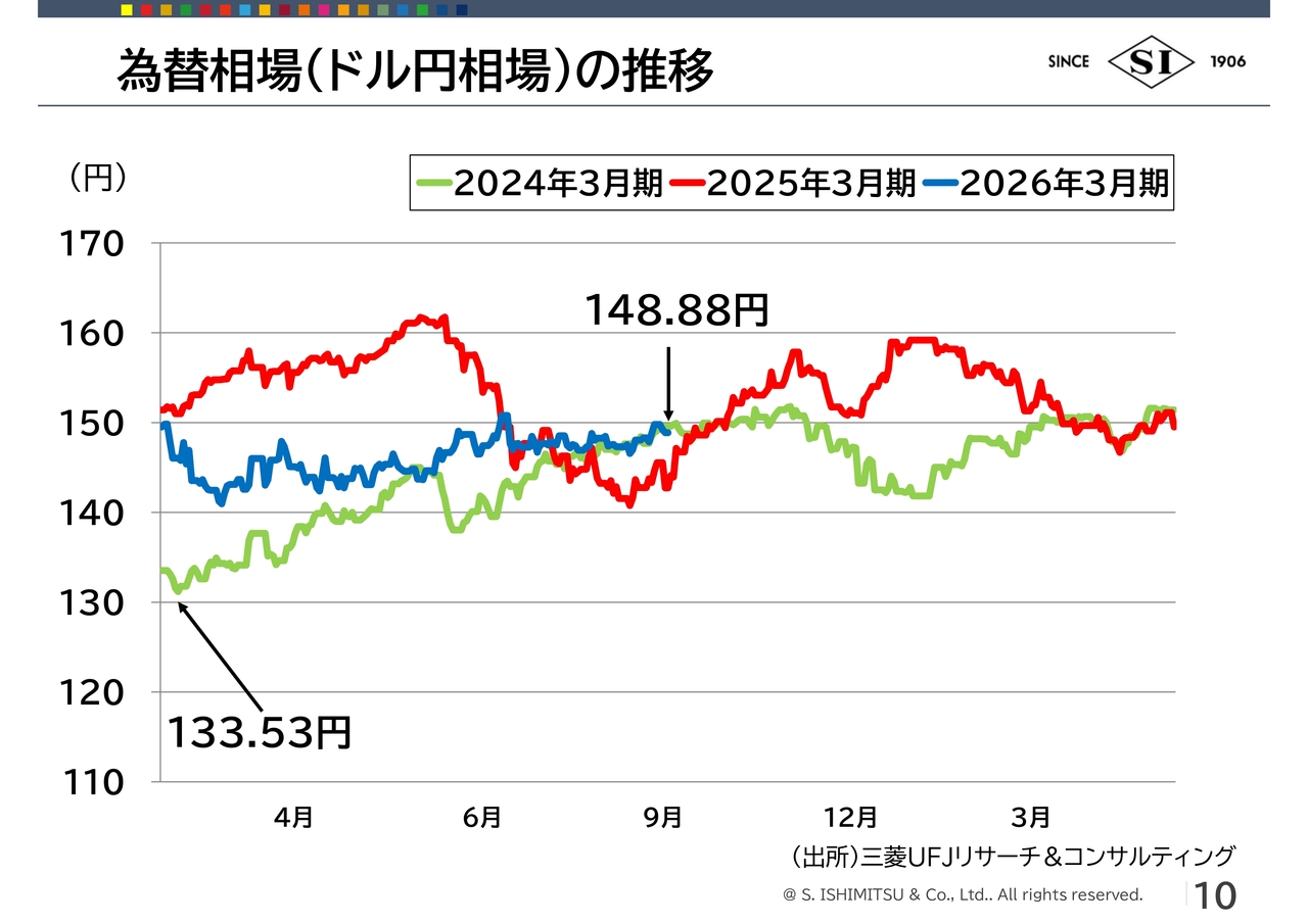 荒川:ドル円の為替相場についてご説明します。2年前の2024年3月期は133円くらいからスタートし、150円ほどとなりました。赤い折れ線グラフで示した2025年3月期は、一時期160円を超え、その後は150円近辺で推移しています。