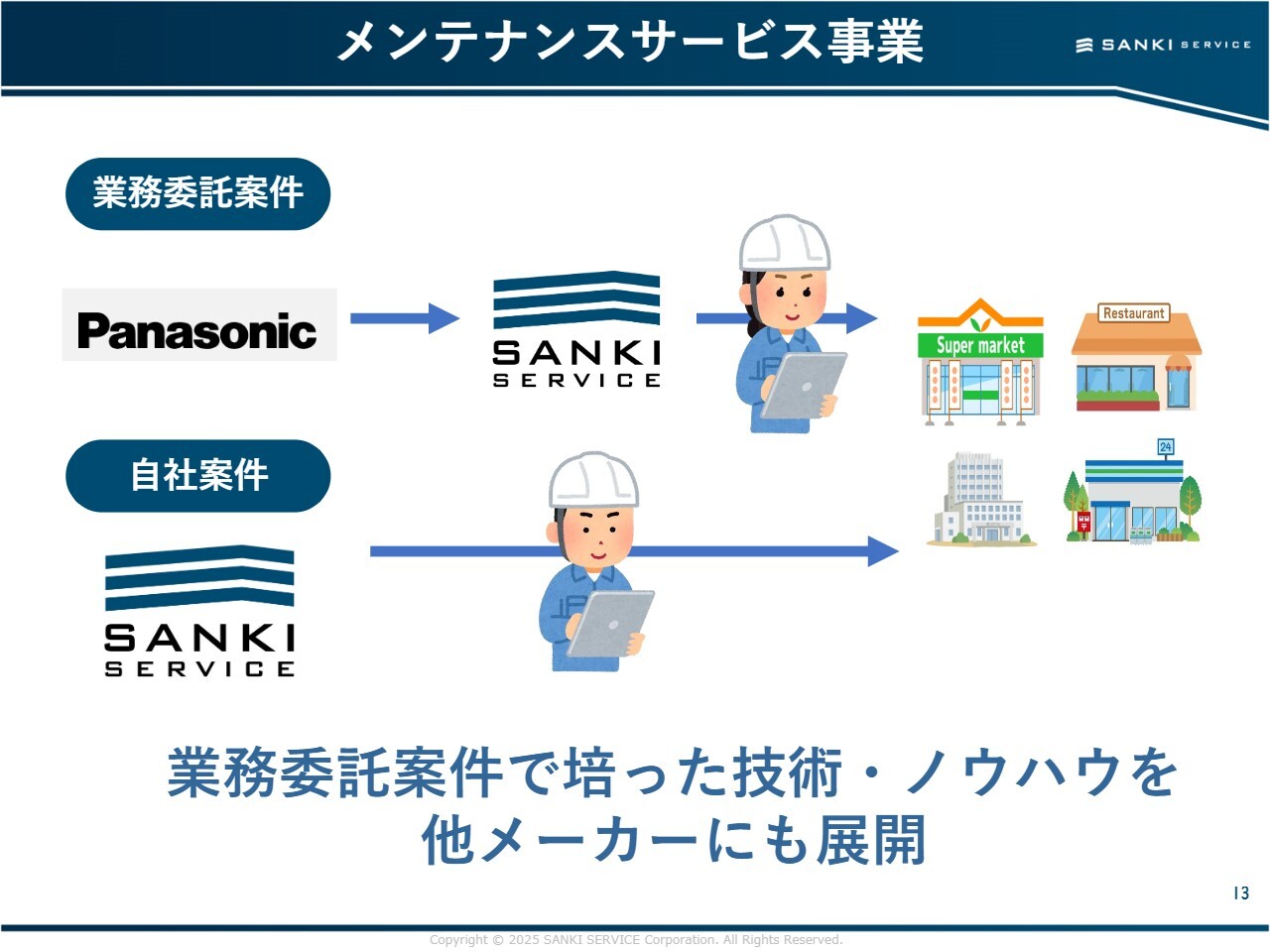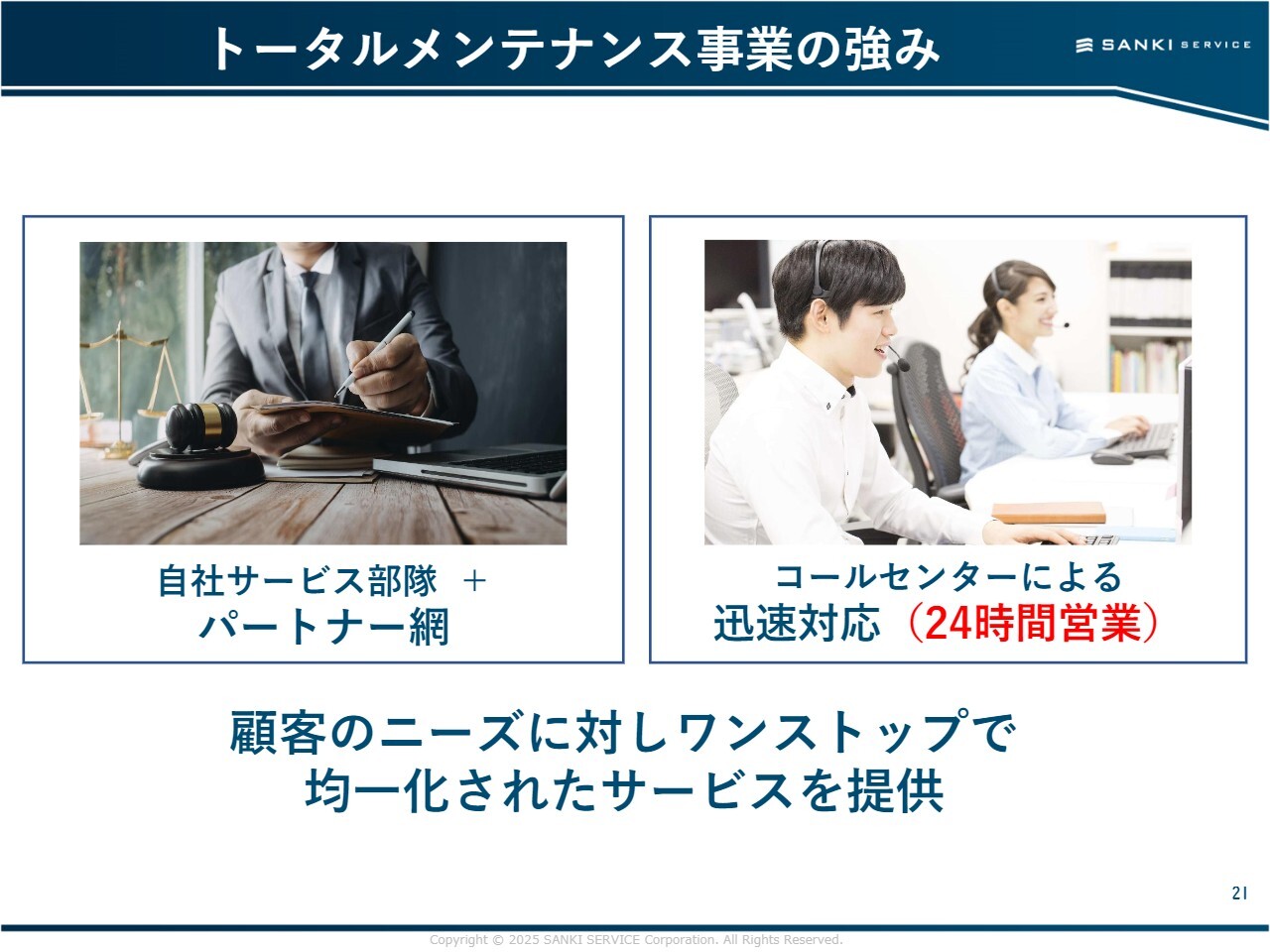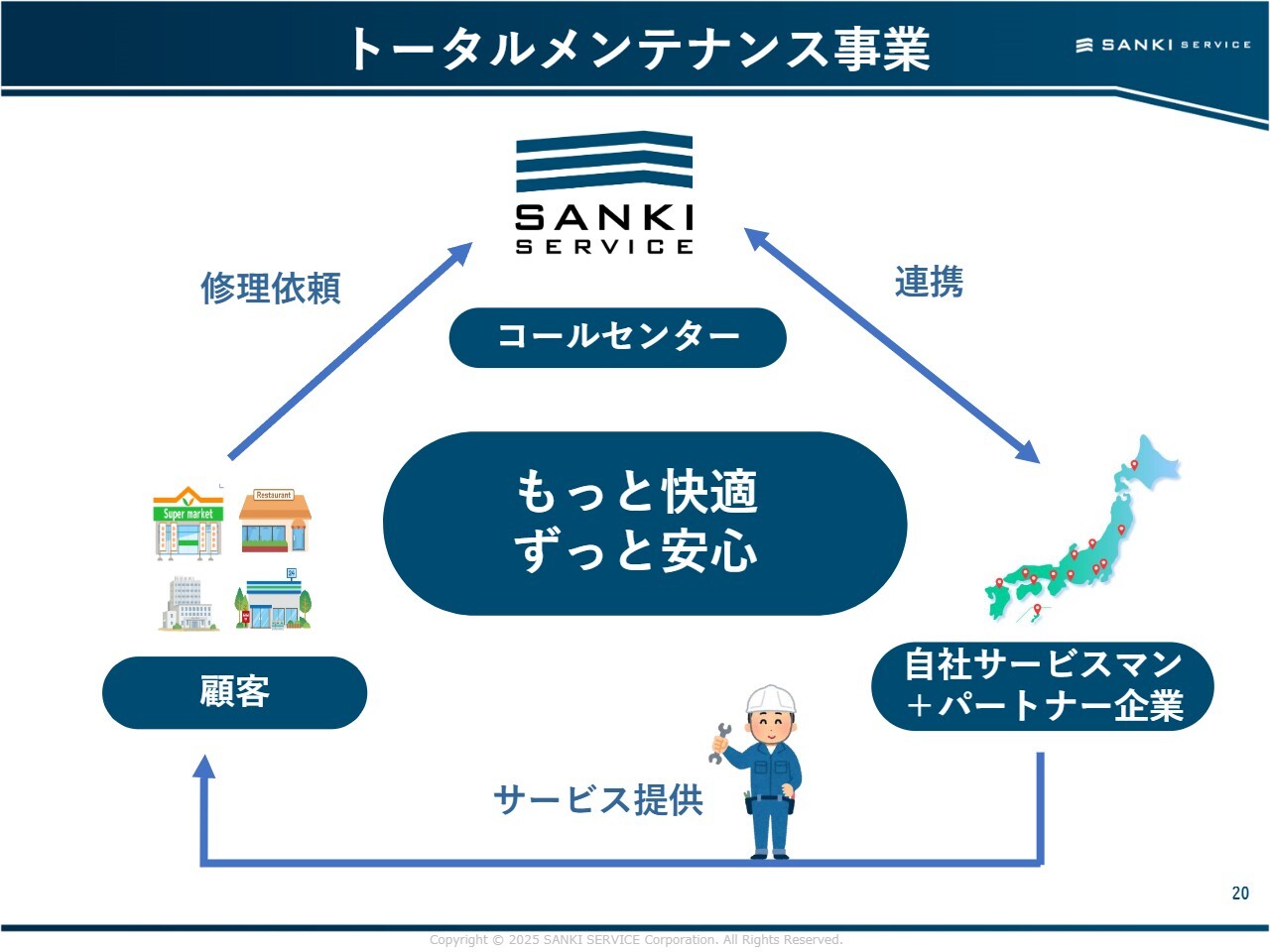 2つ目は小売業などの全国展開しているお客さまに対して空調機器のみならず、さまざまな設備のメンテナンスを一括して担う「トータルメンテナンス事業」です。