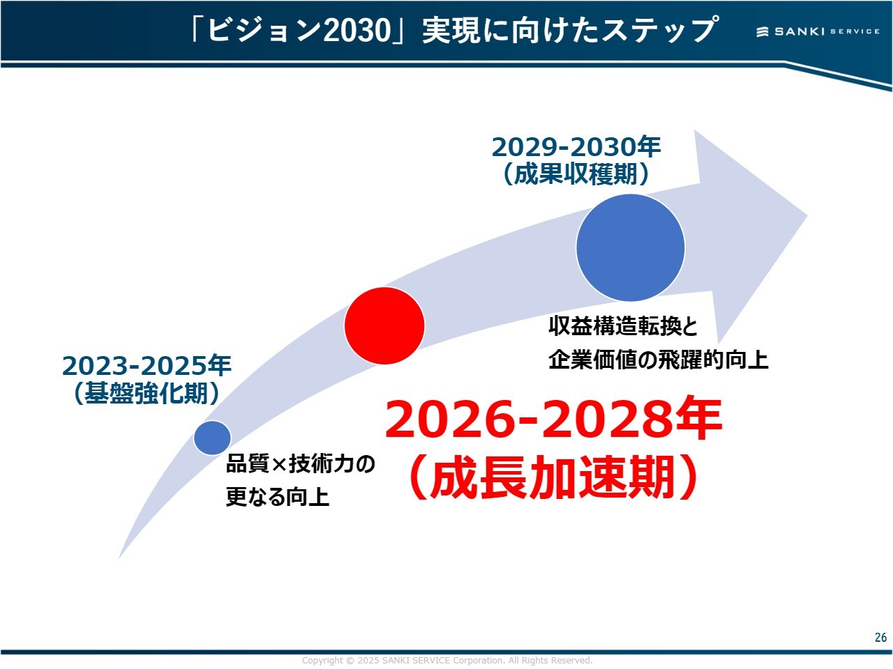 その第一歩が、前中期経営計画の3年間です。この期間を基盤強化期と定義し、当社の価値基盤であるサービス品質と技術力の向上に取り組みました。この基盤強化期での足固めを踏まえ、本中期経営計画での3年間を「成長加速期」と位置づけています。