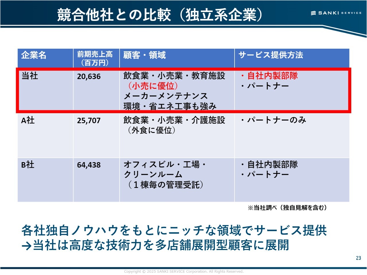 サービス提供方法においては、当社とB社は、自社部隊と協力会社を組み合わせたサービスを提供しています。一方、A社は100パーセントが外注です。