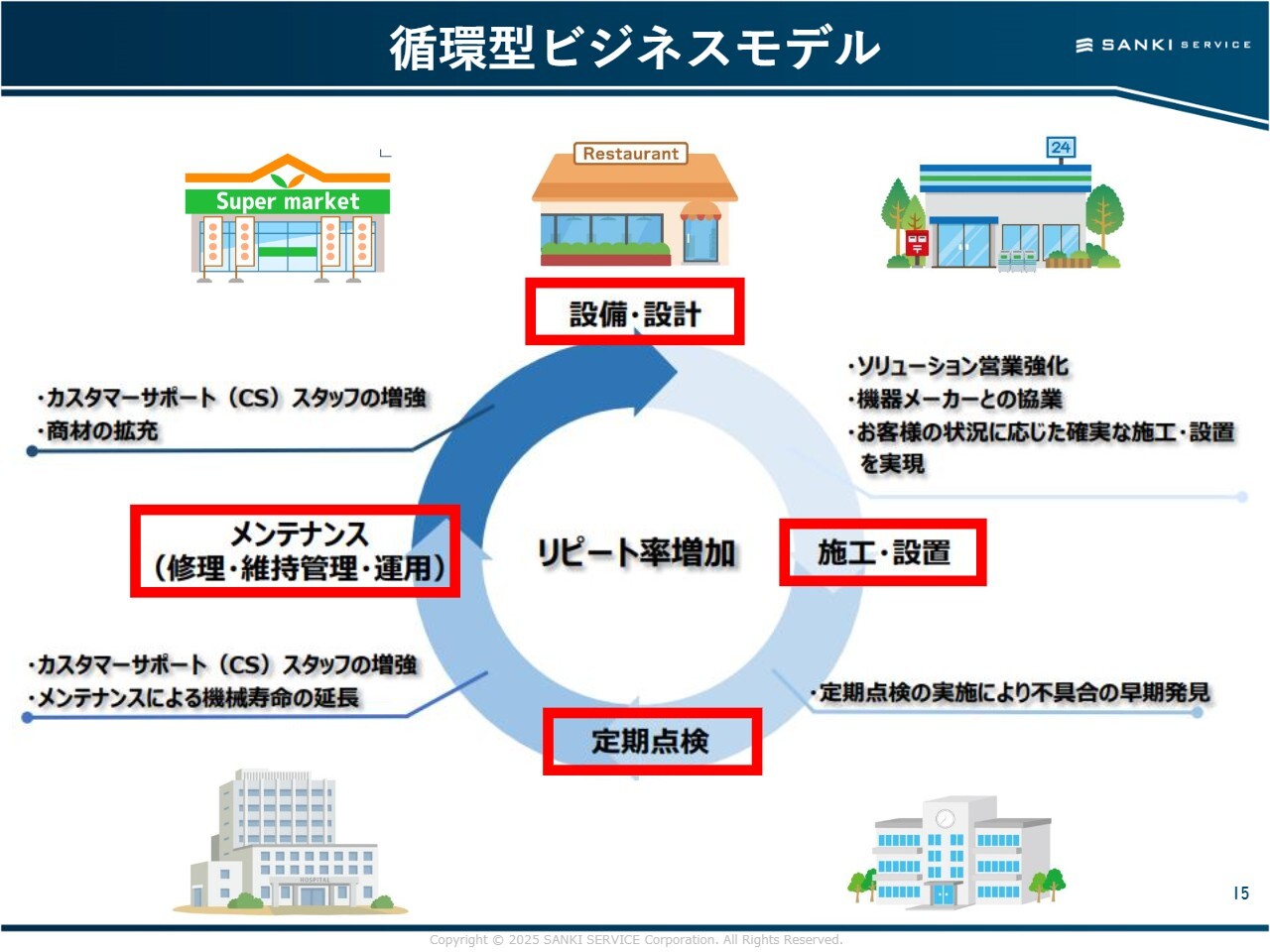 このような取り組みの結果、現在では設備のメンテナンスにとどまらず、さまざまなフェーズでワンストップのサービスを提供する循環型ビジネスモデルを構築しています。