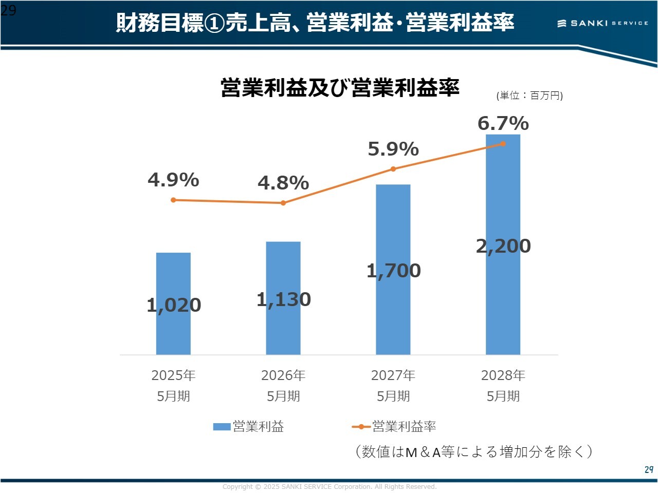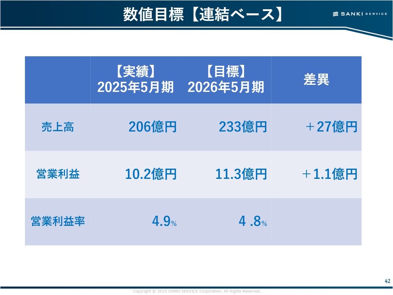 北越:あらためて、今期の計画目標をご紹介します。売上高は前期比プラス27億円の233億円、営業利益は前期比プラス1.1億円の11億3,000万円、営業利益率は昨年度の4.9パーセントからほぼ横ばいの4.8パーセントと設定しています。