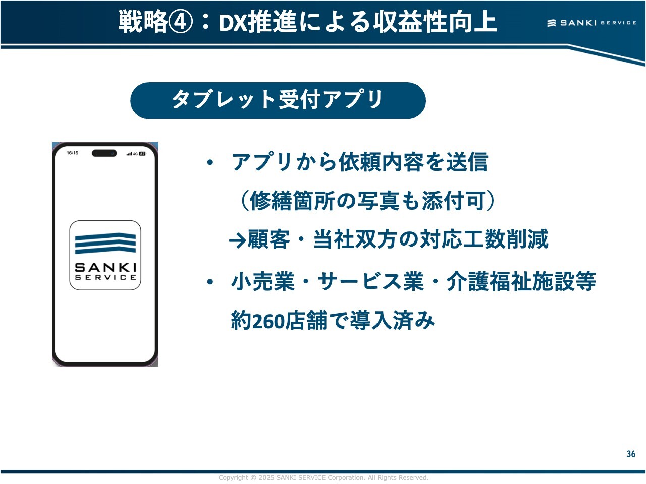 北越:このスライドでは、DX推進に向けた当社の取り組みの1つである「タブレット受付アプリ」についてご紹介します。このアプリは、お客さまがメンテナンスの依頼を簡単に行えるサービスです。