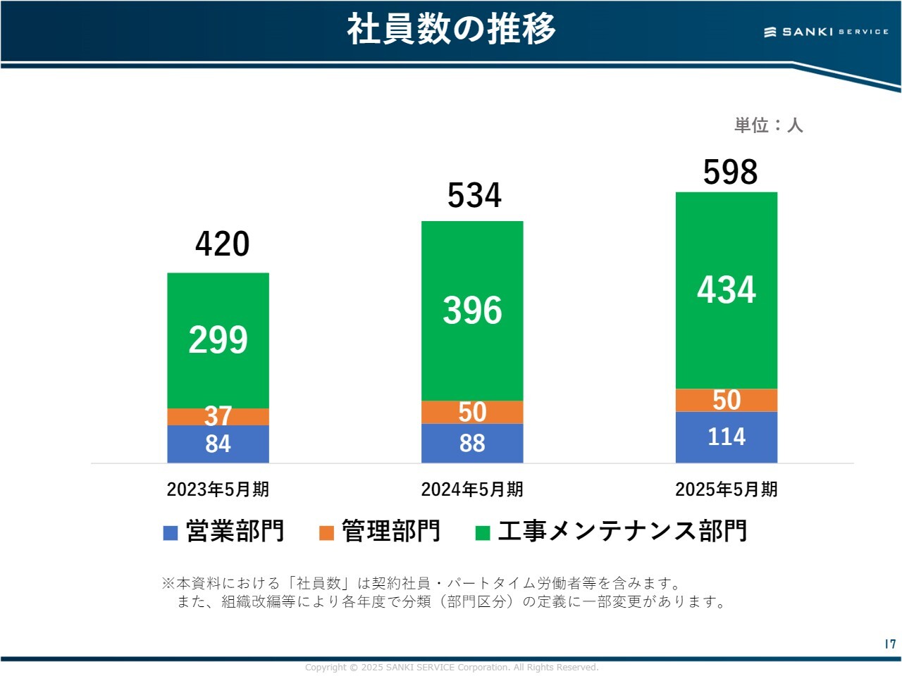 北越:サービスエンジニアをはじめとした採用強化の実績についてご説明します。スライドのグラフは、前中期経営計画3年間の社員数の推移を示しています。
