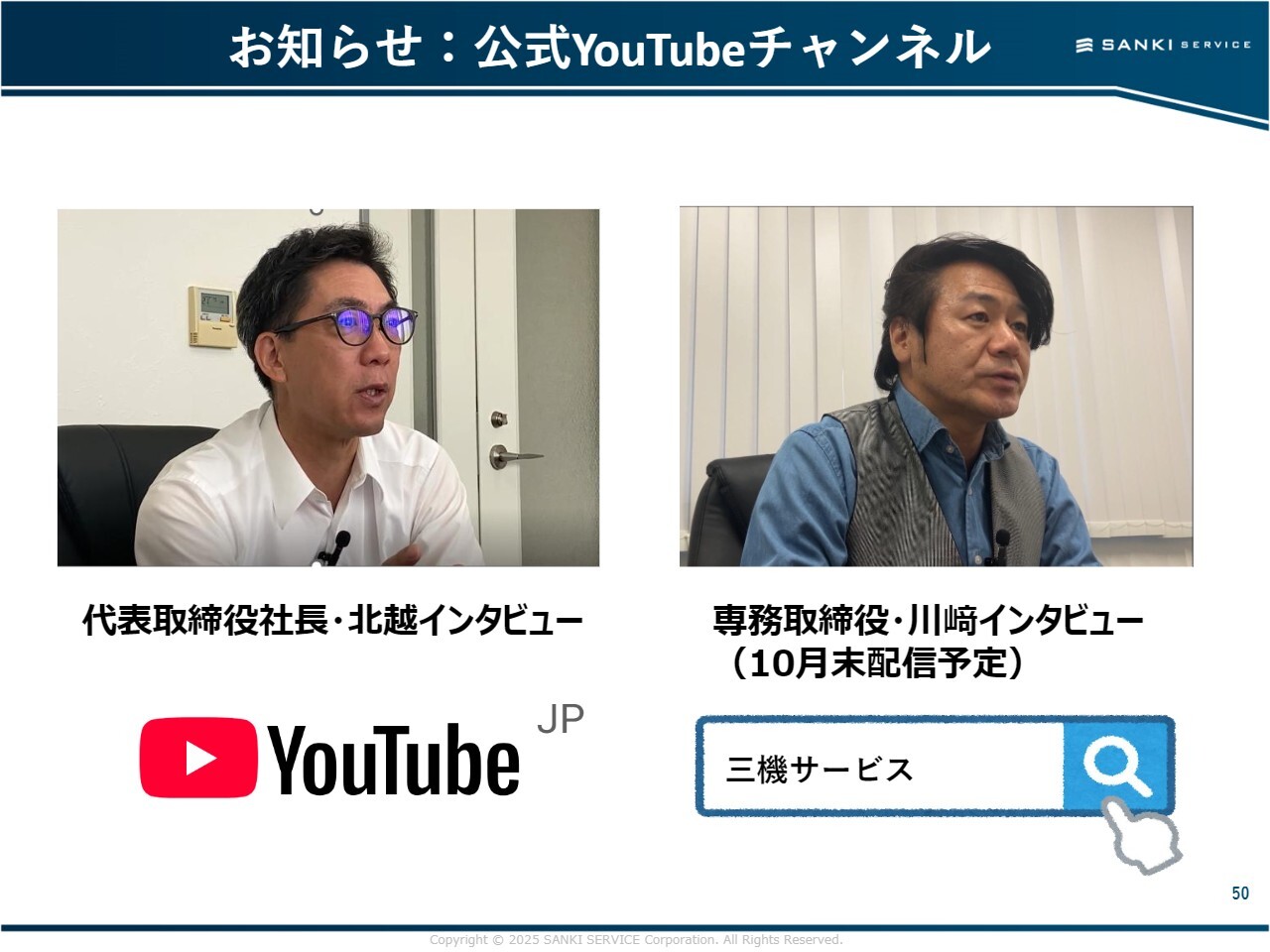 司会者:最後にお知らせですが、先月、当社公式YouTubeチャンネルを開設しました。チャンネルでは、当社代表取締役社長の北越や専務取締役の川﨑が、当社の成長にかける思いをお話しするなど、今後も投資家のみなさまに向けたコンテンツを発信していきます。