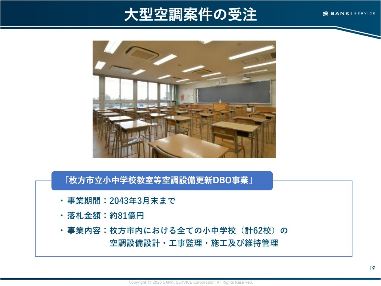 すでに今年2月、東京証券取引所を通じて開示したとおり、大阪府枚方市より、小中学校におけるDBO事業を受注しました。本事業は、当社における史上最大の受注金額として約81億円を見込んでいます。