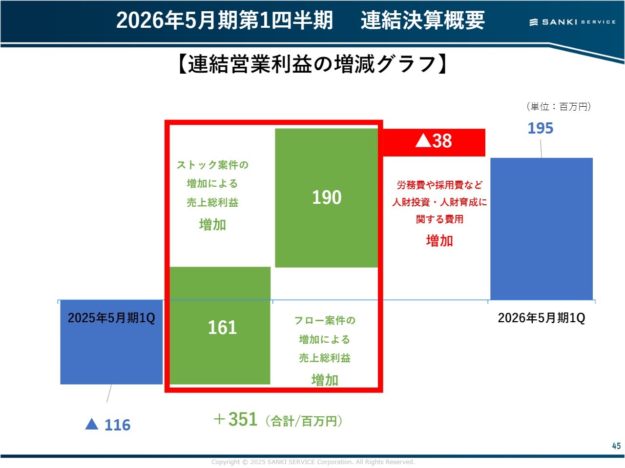北越:連結営業利益の増減分析についてご説明します。第1四半期は、メンテナンスサービス事業、トータルメンテナンス事業ともに売上高が成長し、売上総利益は前年同期より計3億5,100万円増加しました。このうち、ストック案件による増加額は1億6,100万円、フロー案件による増加額は1億9,000万円を計上しています。