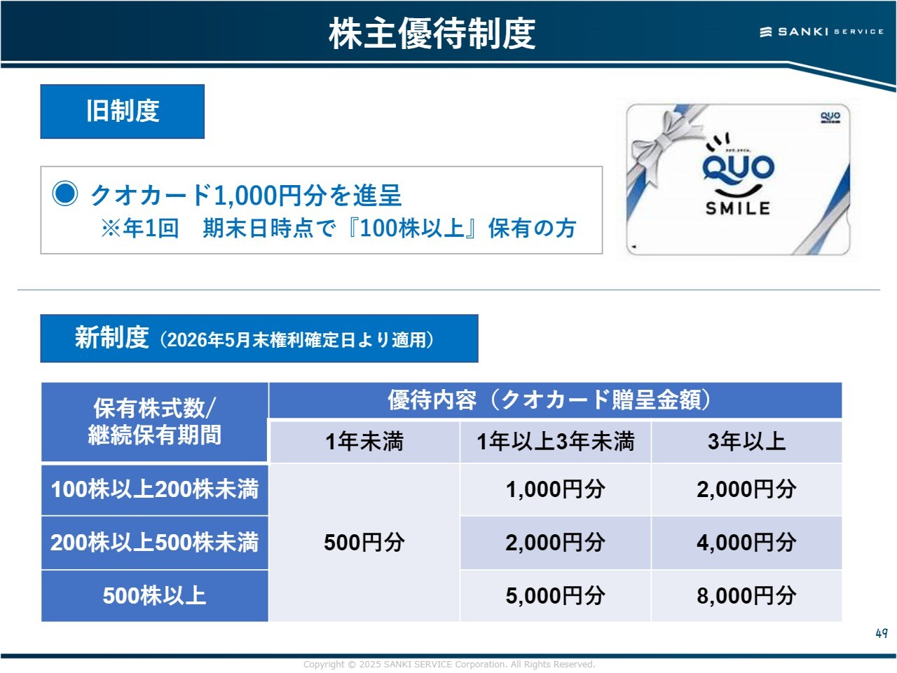 北越:株主優待制度については、2026年5月末分から「長期保有優遇制度」を導入しています。これまでは当社株式を100株以上お持ちの株主さまに対し、一律で「QUOカード」1,000円分を贈呈していたところ、2026年5月末日の権利確定日から新制度を適用します。