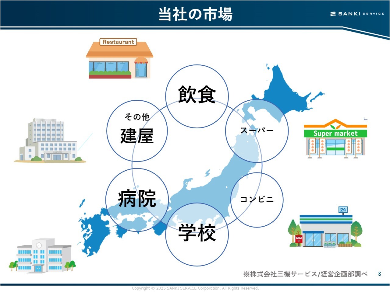 北越:当社の市場についてご説明します。先ほどもお話ししたように、当社の主要なお客さまは、飲食、スーパーやコンビニ、学校、病院といった、みなさまの身近にある、生活になくてはならない業界や施設が多いです。