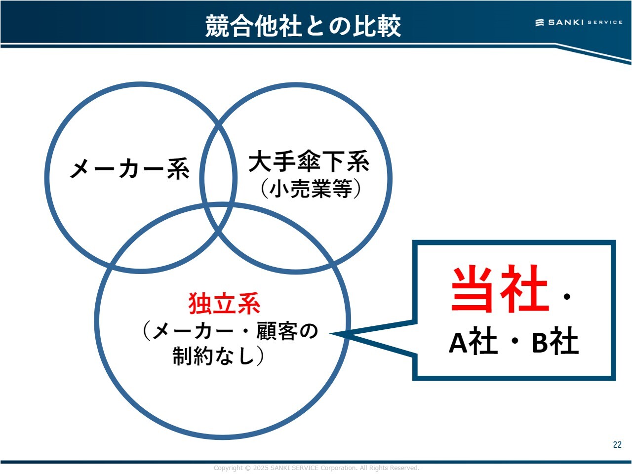 この独立系グループにおいて、競合としてよく取り上げられるA社やB社と、当社との違いをご説明します。