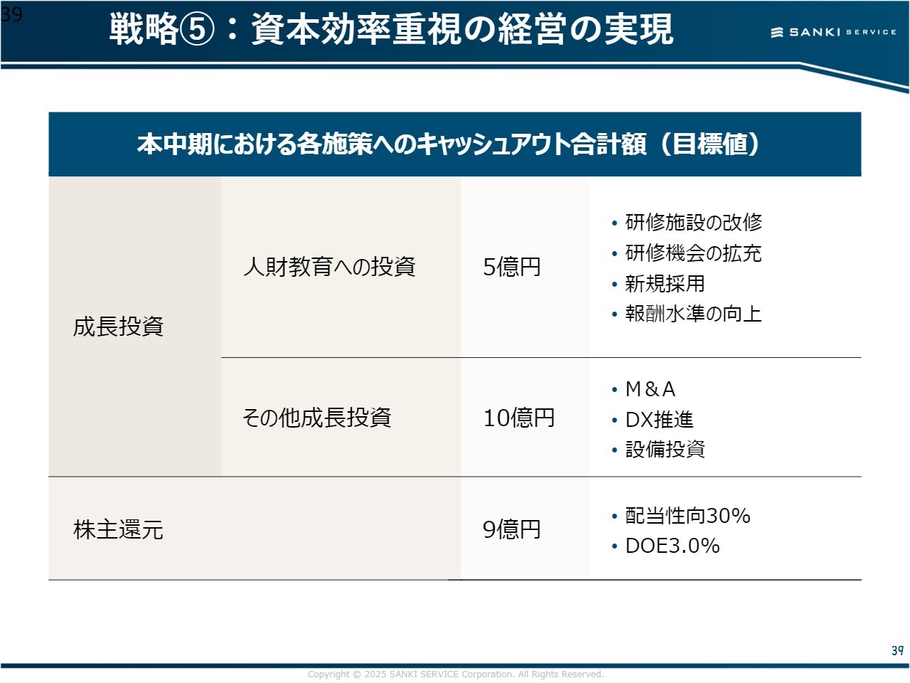 北越:こちらのスライドでは、先ほどの目標を踏まえて策定した、この3年間における各施策へのキャッシュアウトの合計額を表しています。成長投資に約15億円投下します。内訳は、研修施設の改修や新規採用など、人財教育への投資に約5億円、M&AやDX推進といったその他成長投資に約10億円です。