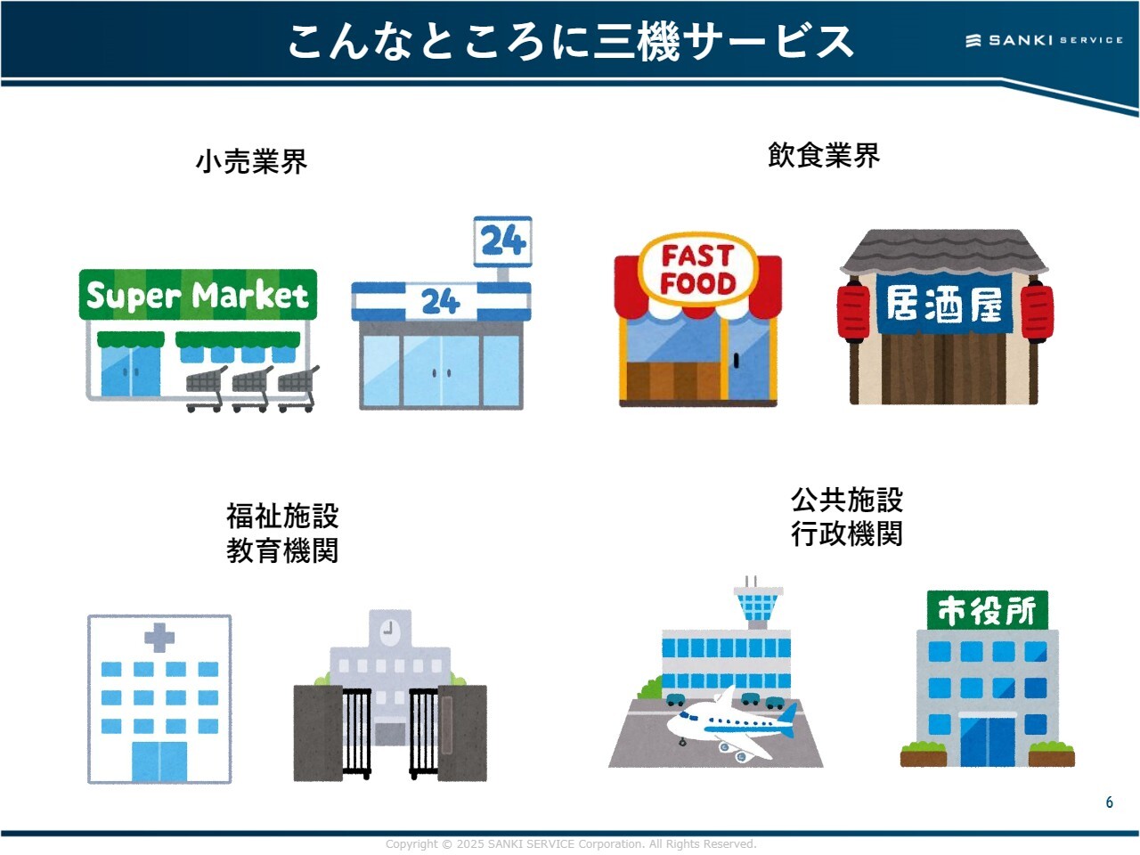 スーパーマーケットやコンビニエンスストアに代表される小売業界、ファストフード店や居酒屋などの飲食業界、病院や学校といった福祉施設や教育機関、さらに空港などの公共施設や行政機関に至るまで、多種多様なお客さまからご愛顧をいただいています。