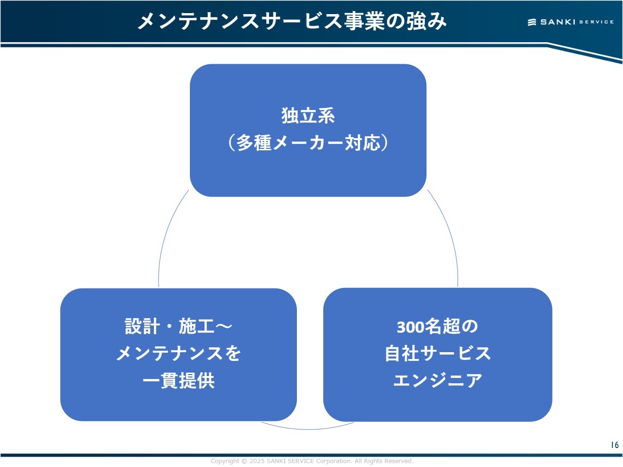近年では、メンテナンスで培った空調機器に関するノウハウを応用し、設備の入れ替え工事や省エネ案件も手掛けています。このような経緯から、当社は、メンテナンスのみならず、設備入れ替えなどの工事を含む大規模案件において、内製により一定の収益を継続的に確保できることが、ビジネス上のメリットだと考えます。(※当回答は株式会社三機サービスの独自見解にもとづきます)