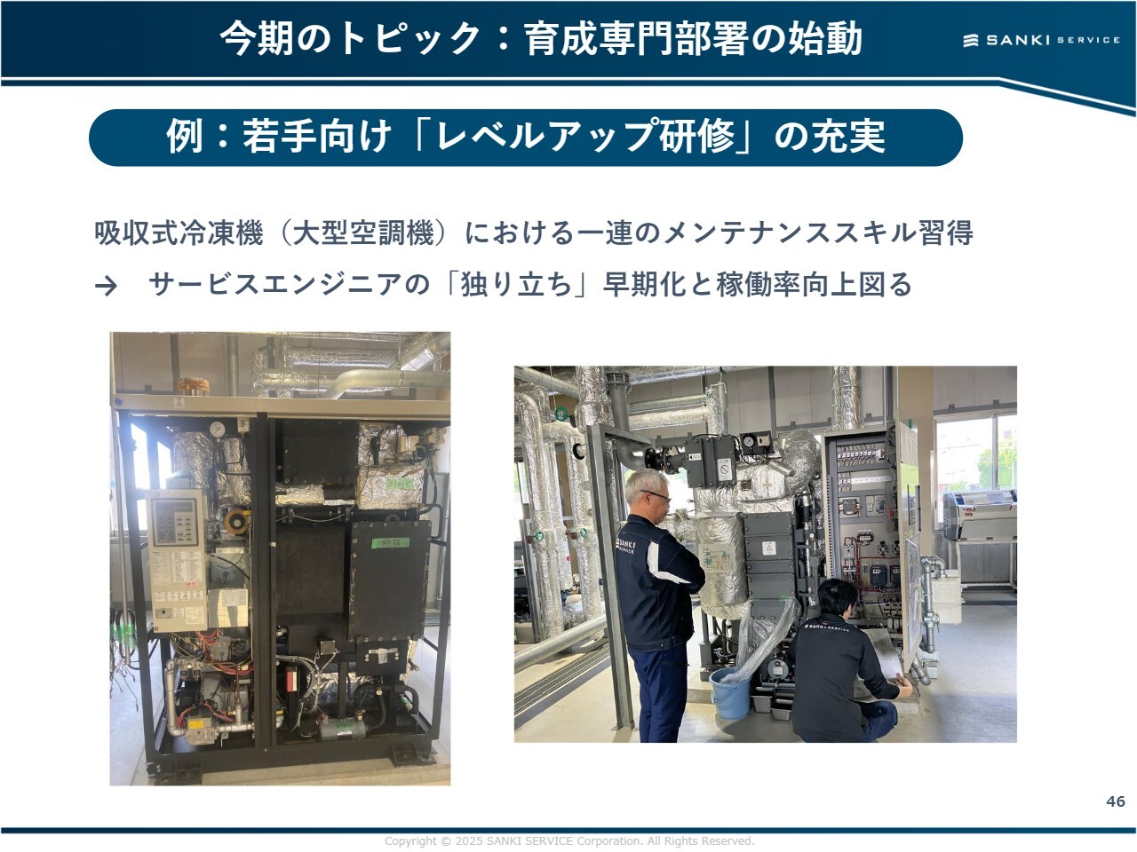 北越:今期のトピックとして、育成専門部署の活動状況をお伝えします。先ほどお伝えしたとおり、今期から社員を育成する部門を立ち上げました。研修メニュー強化の一環として、若手サービスエンジニアのメンテナンス技術を高める取り組みを進めています。