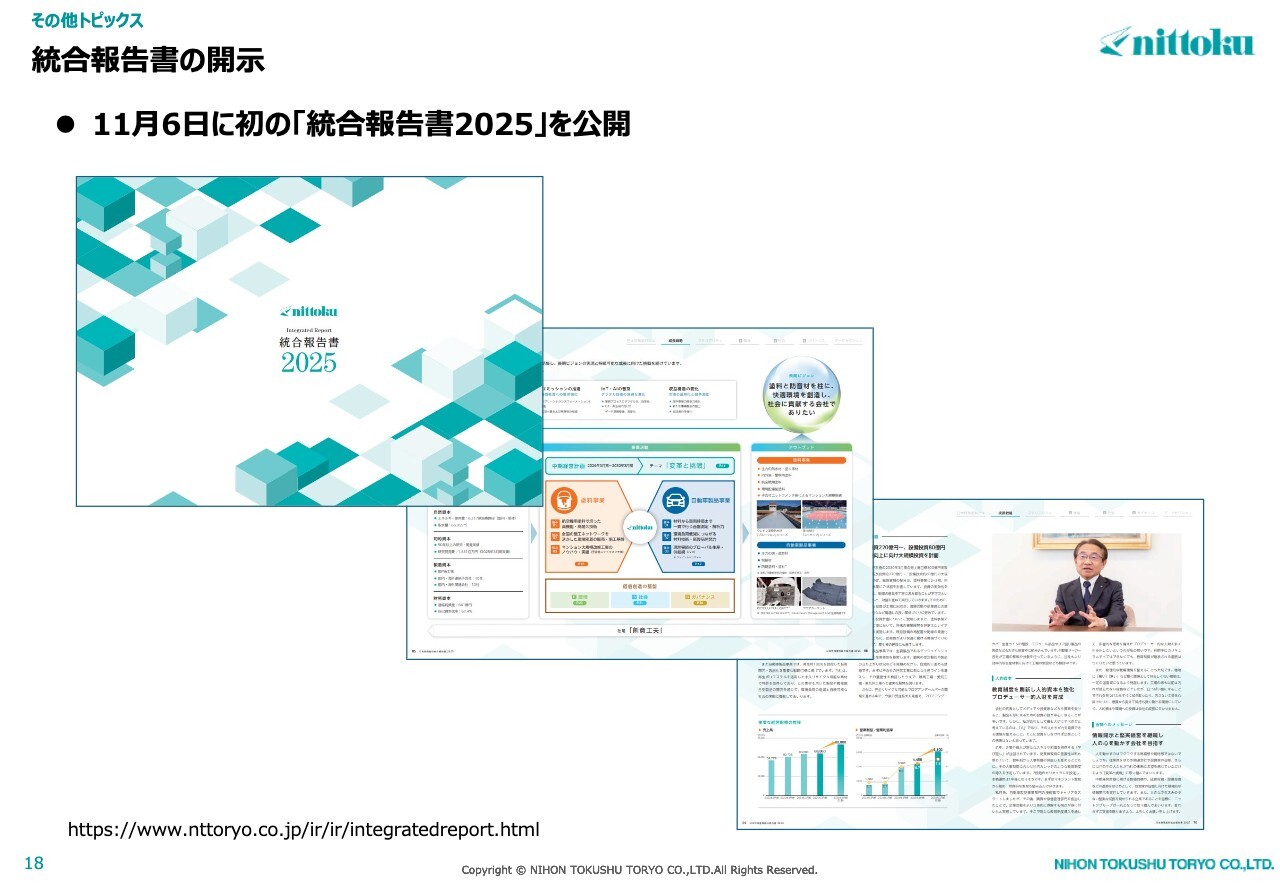 最後にトピックスについてご説明します。11月6日に、当社初の「統合報告書2025」を公表しました。当社のあるべき姿や、現状の取り組みについてご説明しています。
