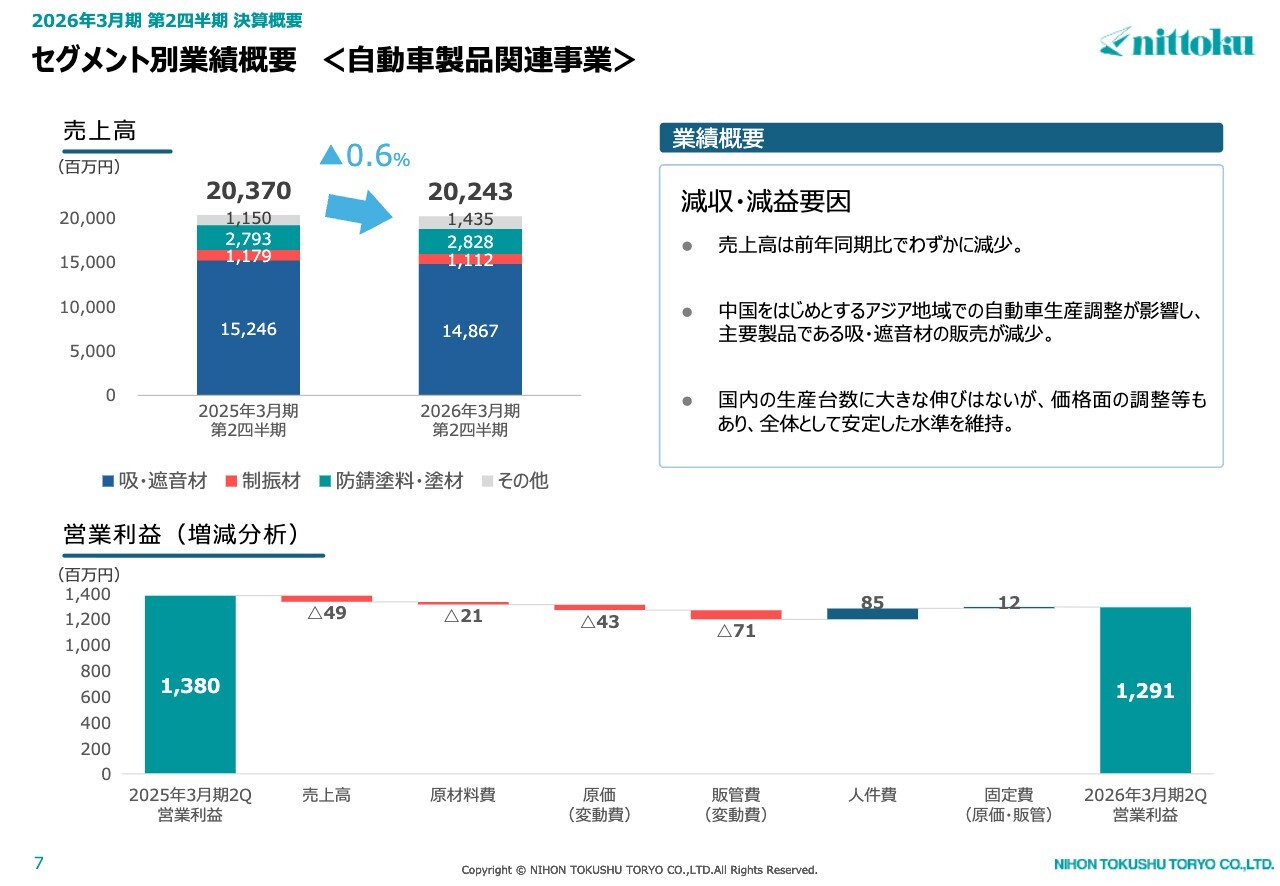 売上高の減収要因については、吸・遮音材で約3億8,000万円減少しましたが、その他に含まれる金型売上などが前年に比べて増加したため、全体としては前年同期比でわずかな減少となっています。
