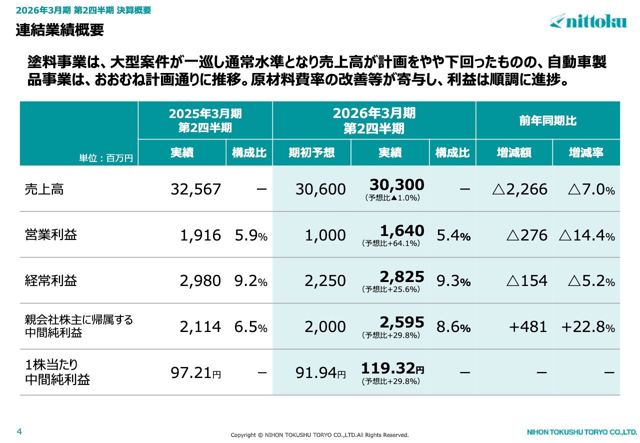 まず通期の見通しです。売上高に関しては、塗料関連事業の請負工事で一部案件の獲得が期初予想を下回り、下方修正しています。一方、営業利益は原材料費率の改善等、また経常利益は持分法利益の増加が寄与し、計画を上回る水準で推移しています。期初予想の達成に向けて順調に進んでいることもあり、上方修正しました。