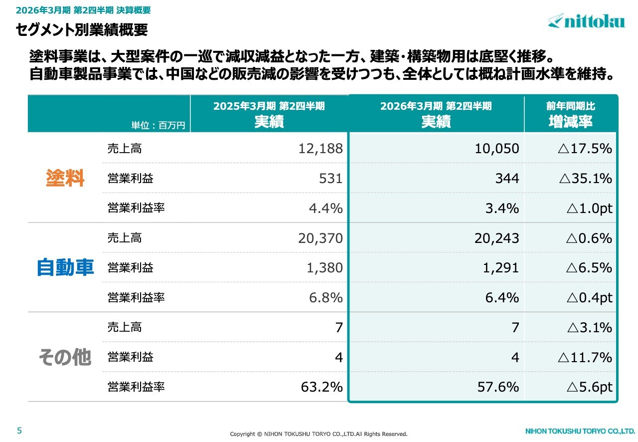 業績については、塗料関連事業は前年の大型案件集中の反動により減収減益となったものの、建築・構築物用塗料の需要は底堅く推移しました。また自動車製品関連事業では、中国市場での販売減の影響があるものの、全体としてはおおむね計画水準を維持しています。