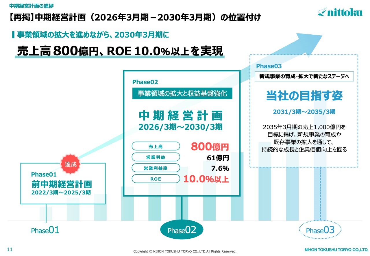 遠田:今期スタートした中期経営計画の進捗状況についてご説明します。まず5月に発表した本中期経営計画では、5年後の2030年3月期に売上高800億円、ROE10パーセント以上の達成を目指します。