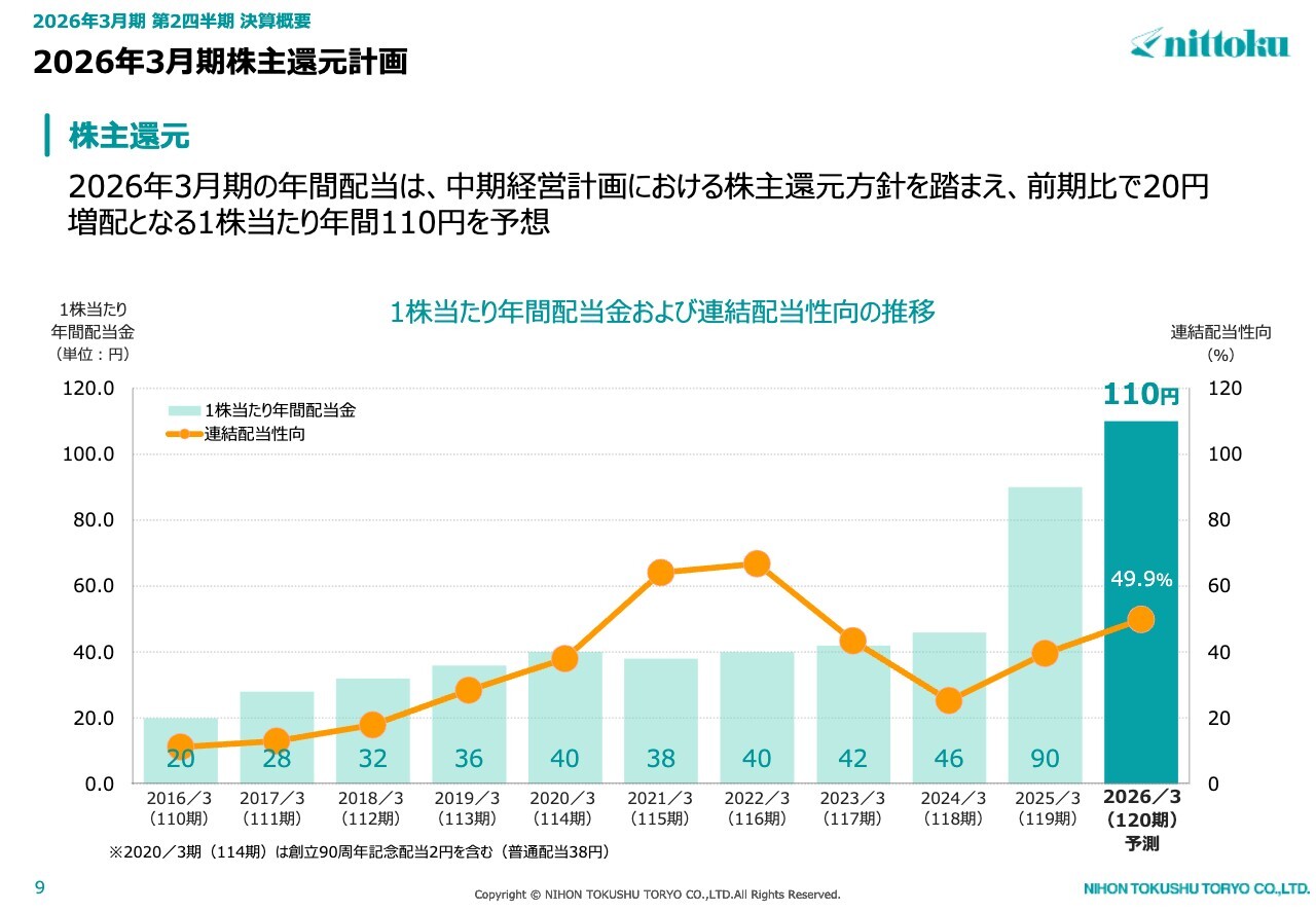 2026年3月期の株主還元計画についてご説明します。まず年間配当は、中間経営計画における株主還元方針を踏まえ、前期比で20円増配となる1株当たり年間110円を予想しています。