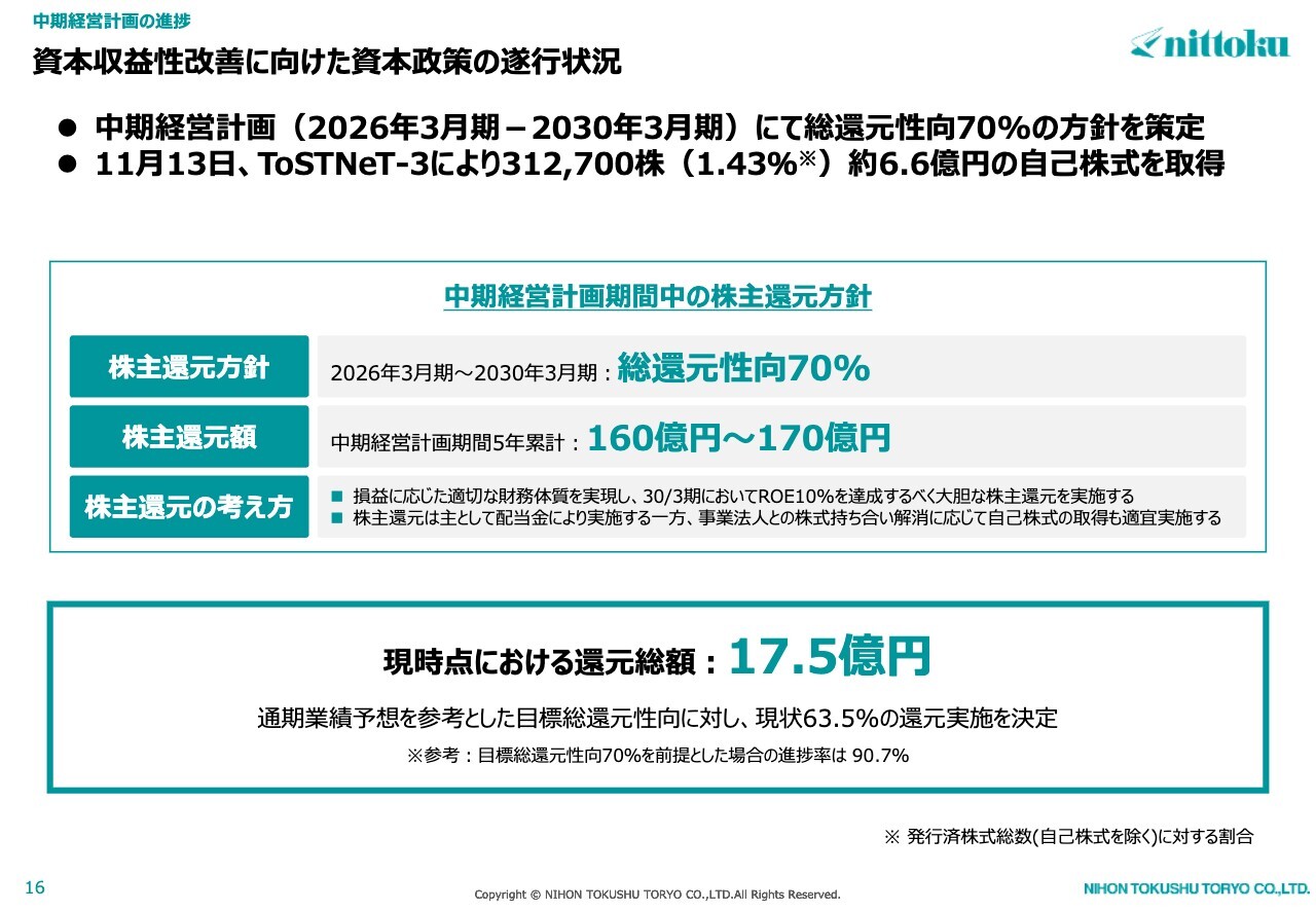 これまでの資本政策の遂行状況についてご説明します。中間配当は50円としています。11月13日に実施した約6億6,000万円の自己株式取得を含め、現時点での還元総額は17億5,000万円です。