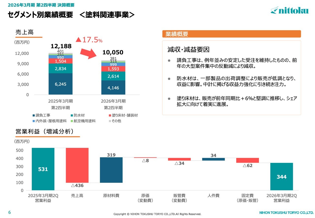 防水材については一部で販売低迷の影響を受け、売上高は約2億2,000万円の減収となっています。一方、塗り床材については前年同期比6パーセント増、金額にして8,900万円の増加となり、堅調に推移しています。