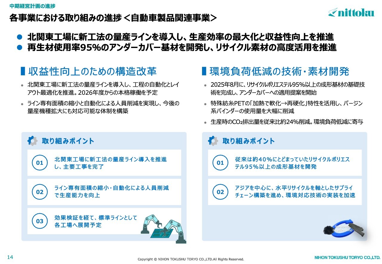 自動車製品関連事業では、リサイクル材使用率95パーセントの製品開発や、生産効率および収益性を向上させた新たな生産ライン導入が順調に推移しています。