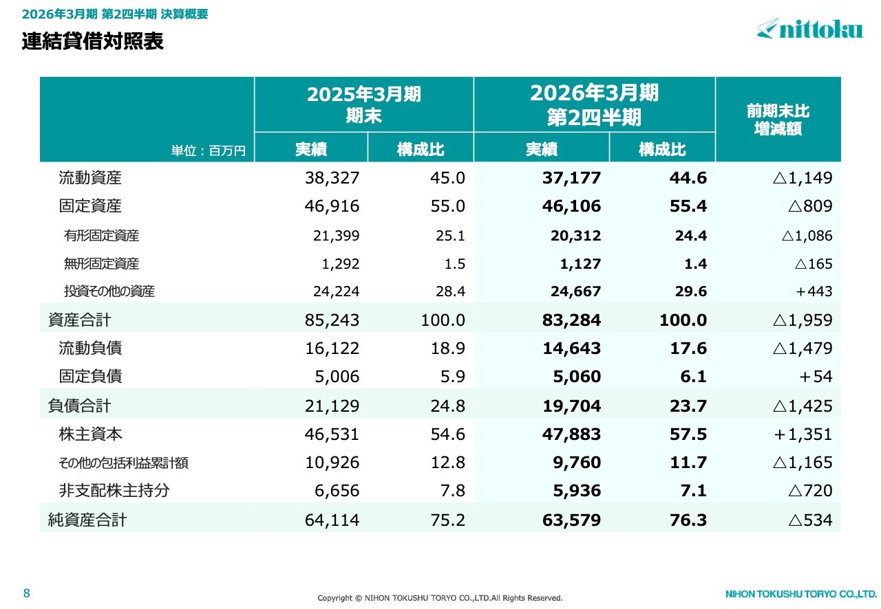 連結貸借対照表についてご説明します。こちらは前期末である2025年3月期期末との比較となっています。
