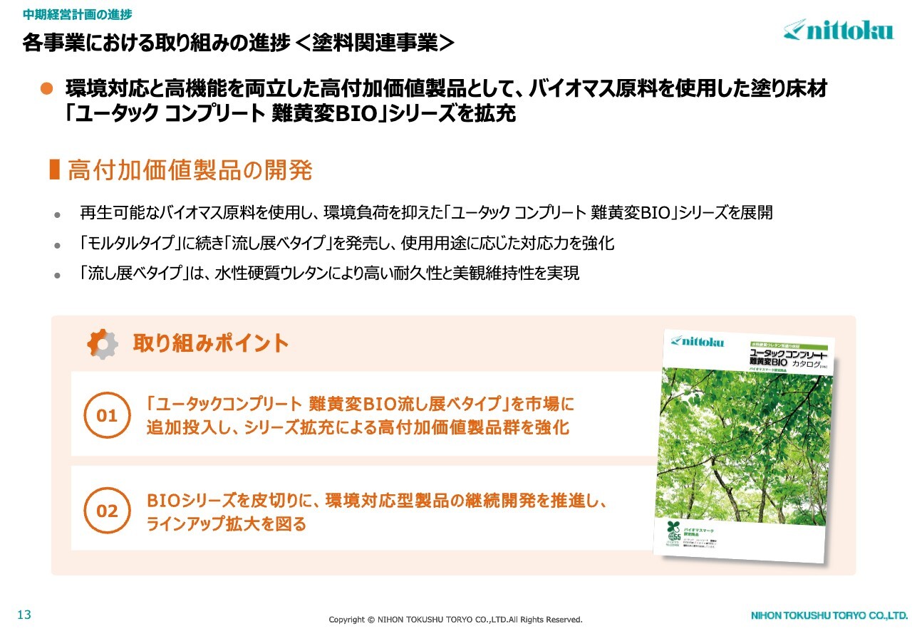 塗料関連事業における高付加価値製品の開発状況についてお話しします。環境対応と高機能を両立した高付加価値製品として、バイオマス原料を使用した塗り床材「ユータック コンプリート 難黄変BIO」シリーズを新たに拡充しました。