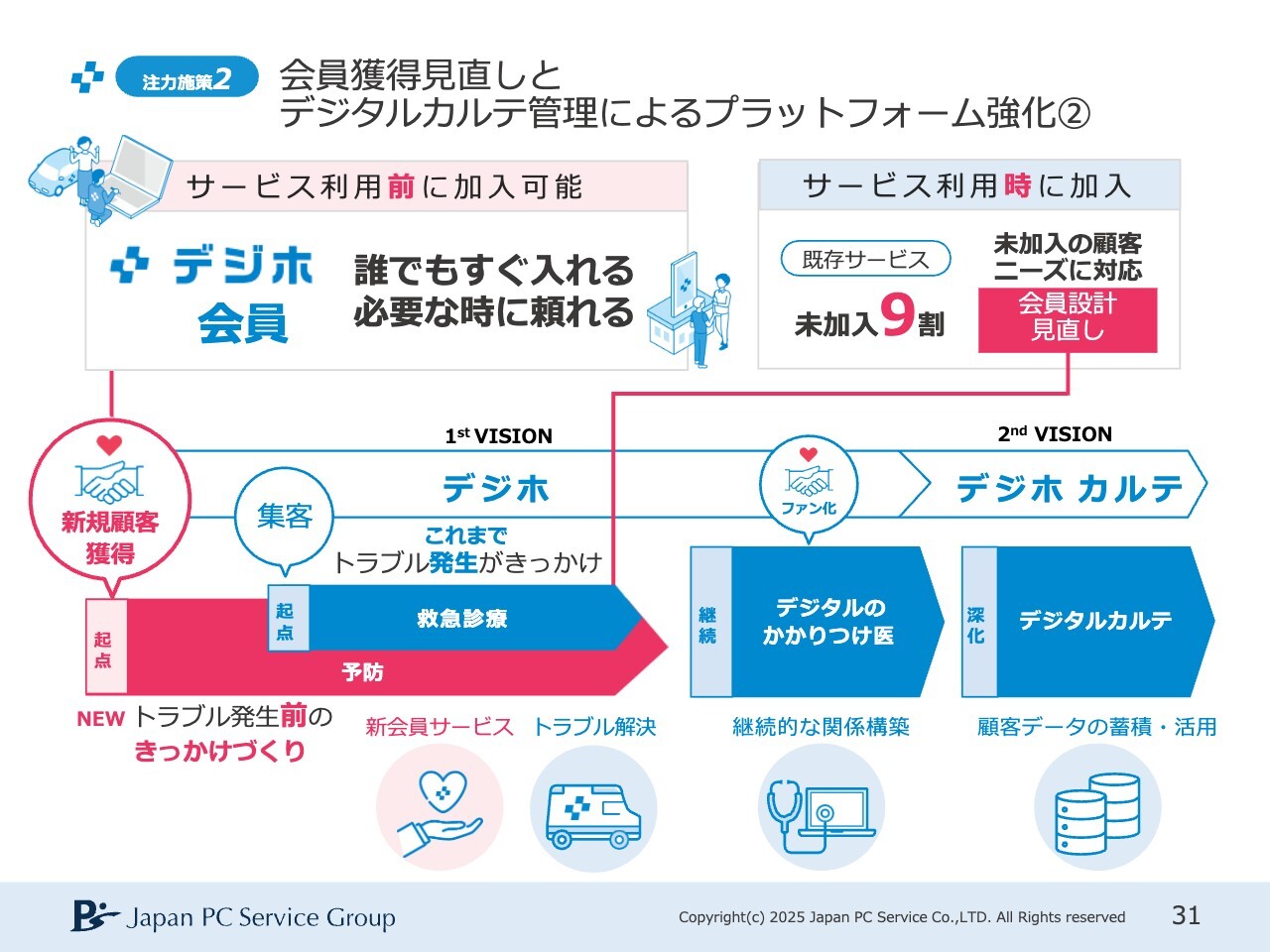 今回は「Windows10」の入れ替え作業も多数行っていますが、不具合が発生した際には、デジタルカルテを活用し、ユーザーのお客さまに関連するサービスをご案内できます。そのため、デジタルカルテをしっかり強化することを目指し、まずは会員加入の設計を新たに進めていきたいと考えています。