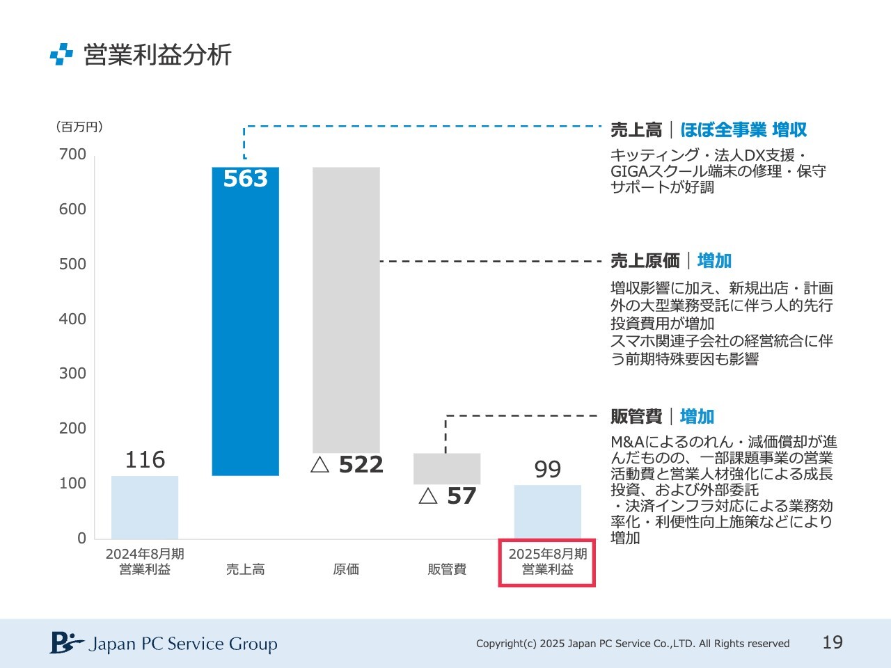 また、現場作業において、これまで現金やクレジットカードでお客さまから料金を回収していましたが、極力現金の利用を削減する方針を取っています。その結果、決済インフラにかかる手数料が増加しており、営業利益は9,900万円という結果となりました。