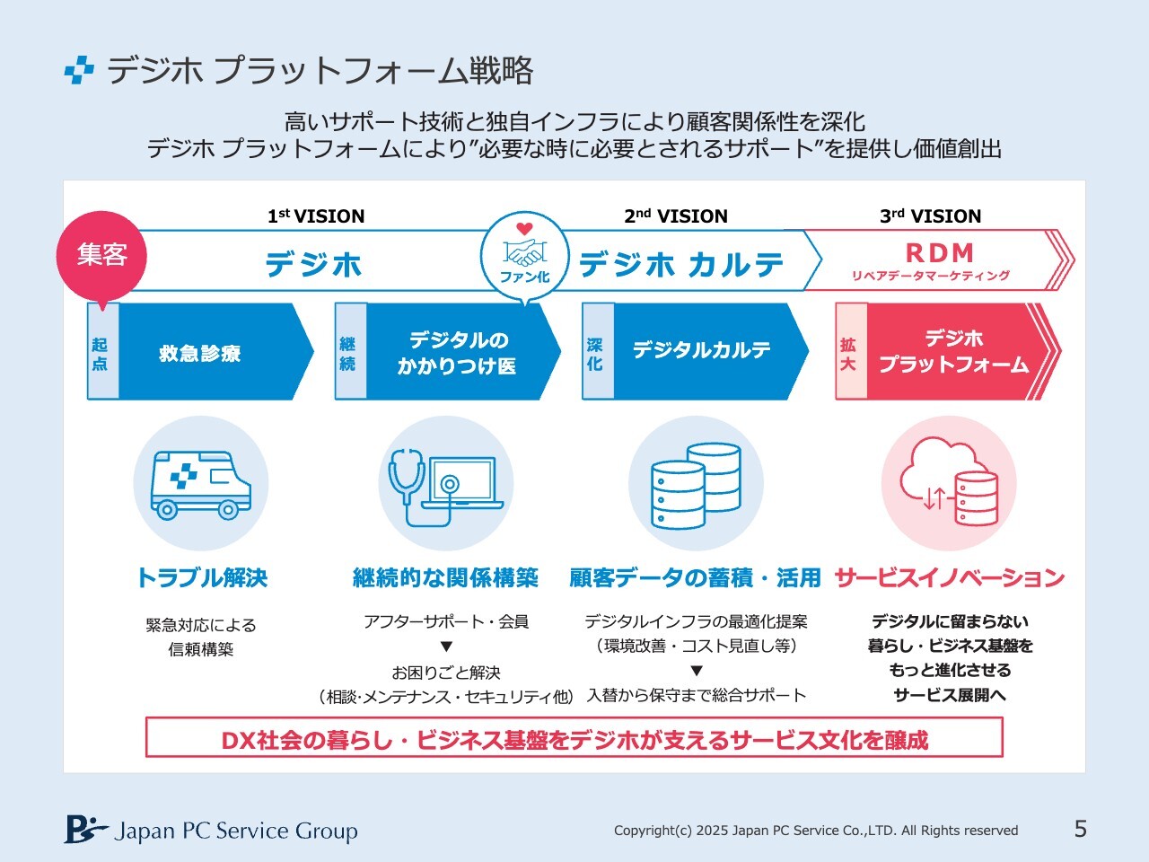 「『パソコンのJAF』を作ろう」と言って名古屋証券取引所に上場した経緯がありますので、「デジタルで困ったら『デジホ』」という文化をしっかりと築いていきたいと考えています。また、営業利益については先ほどお話ししたように、5パーセントから7パーセントを継続的にしっかり出していけるようにしていきたいと思っています。