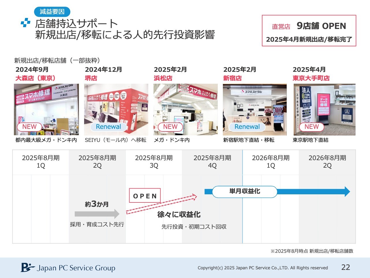 現在、店舗の新規出店はすべて完了しており、この進行期では新規出店や移転については収益化の段階に入っています。そのため、今後この影響はないと考えています。