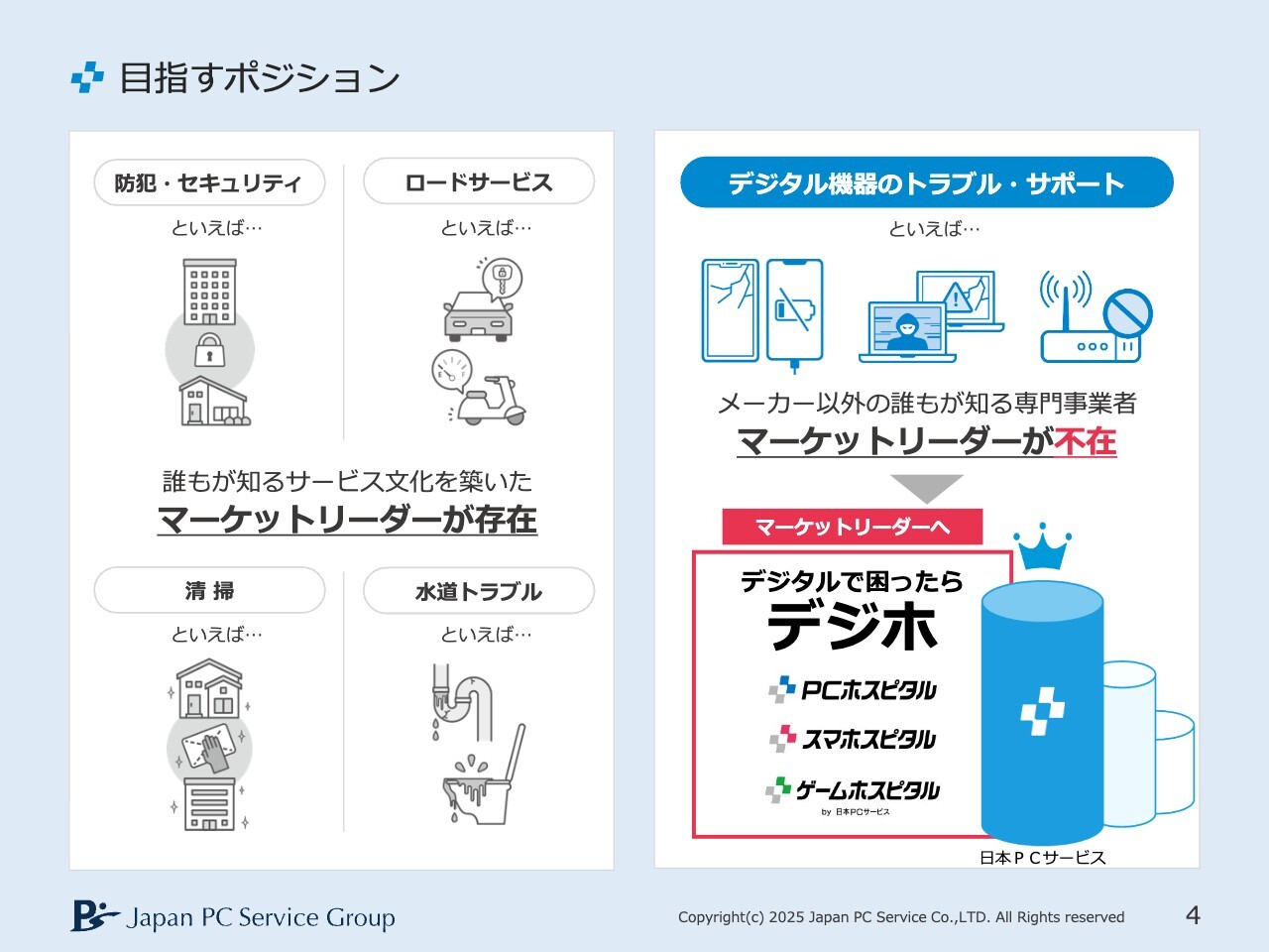 こちらのスライドは再掲です。冒頭にもご説明しましたが、私たちのビジネスは、困った時に真っ先に思いついてもらうことが重要です。JAF、セコム、ダスキン、クラシアンを思い浮かべるように、「デジタルで困ったら『デジホ』」を真っ先に思い出していただけるポジションを目指しています。
