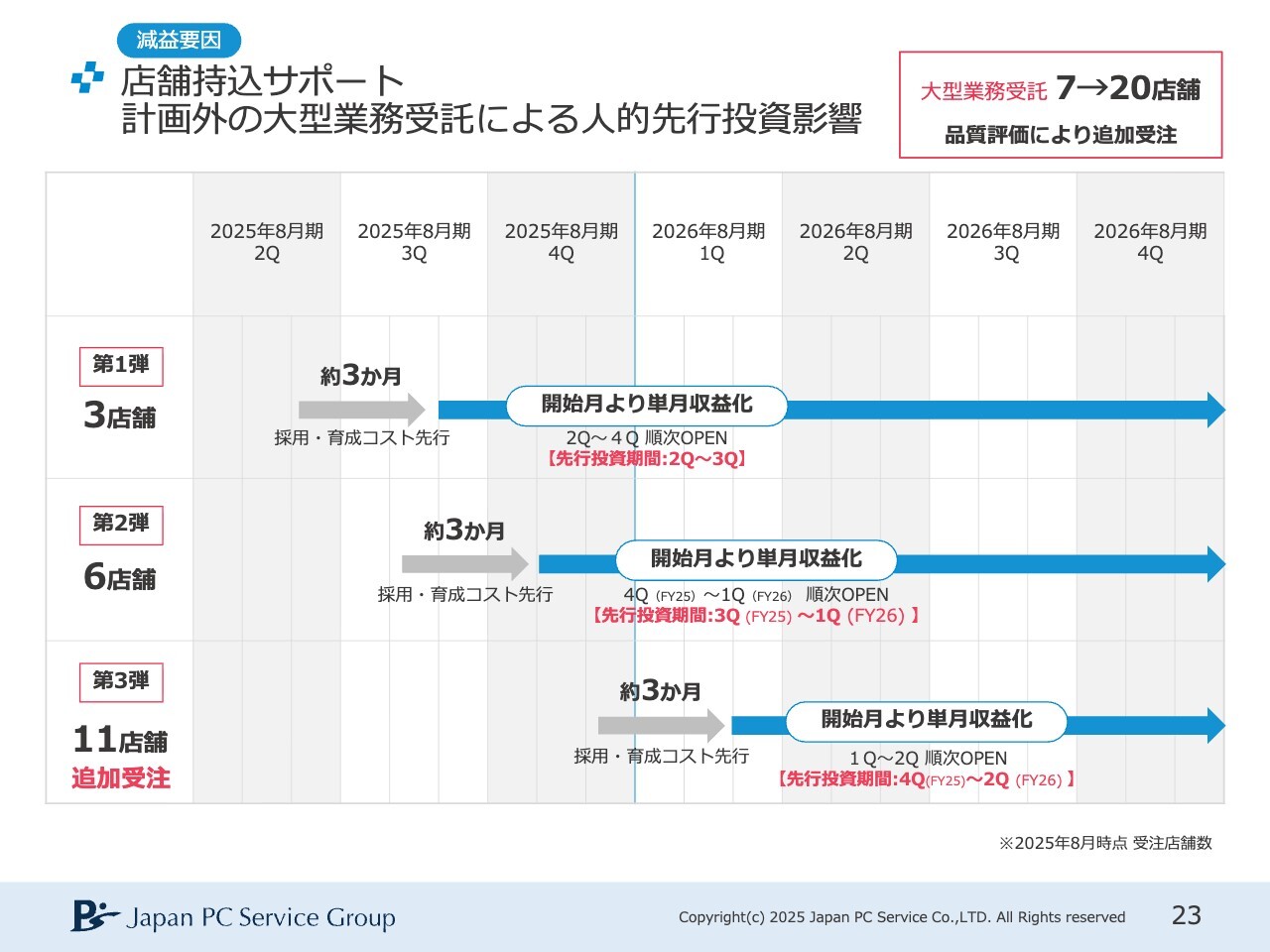 大型業務受託についてです。第2四半期には、第1弾・第2弾まで示していました。当初は第1弾・第2弾のみを想定しており、それ以降は未定でしたが、私たちのサービス品質を評価していただき、追加で受注をいただきました。その結果、この進行期ではさらに11店舗へ人員を投入することになります。