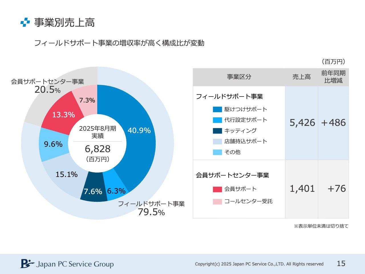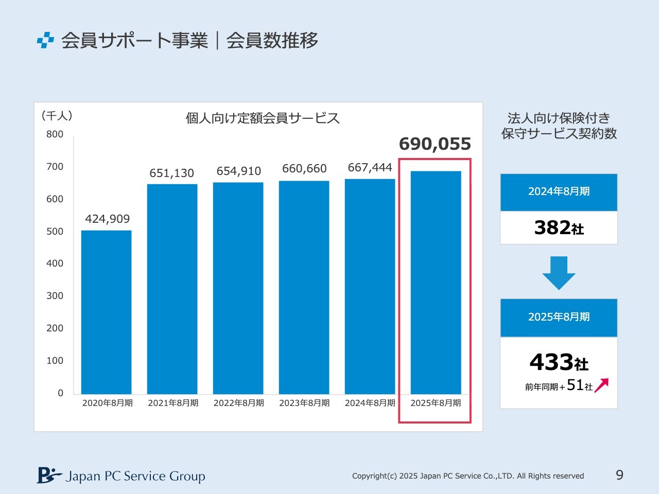 会員サポート事業についてです。個人向け定額会員サービスは順調に伸びており、この決算期に69万人を突破しました。法人向け保険付き保守サービスの契約数は433社となり、前期決算から51社増加しました。ただし、私としてはまだまだ物足りない数字だと考えています。