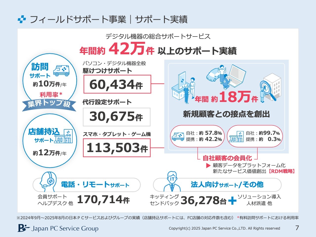 先ほどからお話ししている「デジホ プラットフォーム」についてです。年間約18万件のお客さまと接し、会員数は69万人以上に上ります。全国のサポート拠点は訪問が271拠点、持込が124店舗あり、コールセンターも併せ持つ充実したサポートインフラとなっています。また、提携企業は900社以上、テクニカルサポート人材は400名以上在籍しています。