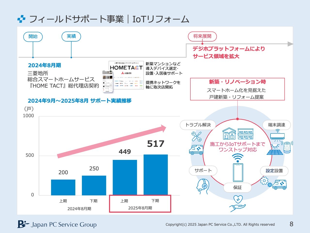 IoTリフォームについてです。フィールドサポート事業の中でもすぐに結果が出る取り組みではありませんが、中長期的にサービスを展開しています。三菱地所さまとの提携リリースも発表し、2025年8月期の下期には517戸にサービスを提供しました。