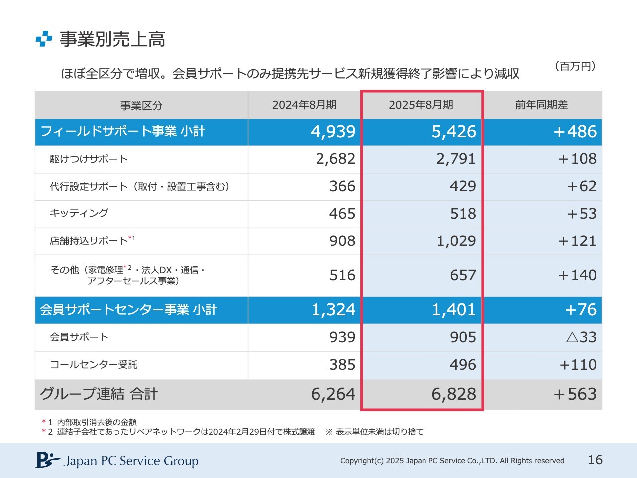 事業別の内訳を見ると、ほぼ全区分で増収となっています。ただし、会員サポートにおいては残念ながら減収となりました。これは、会員サービスを提供している1社で新規顧客の獲得が止まり、伸び悩みが生じたためです。