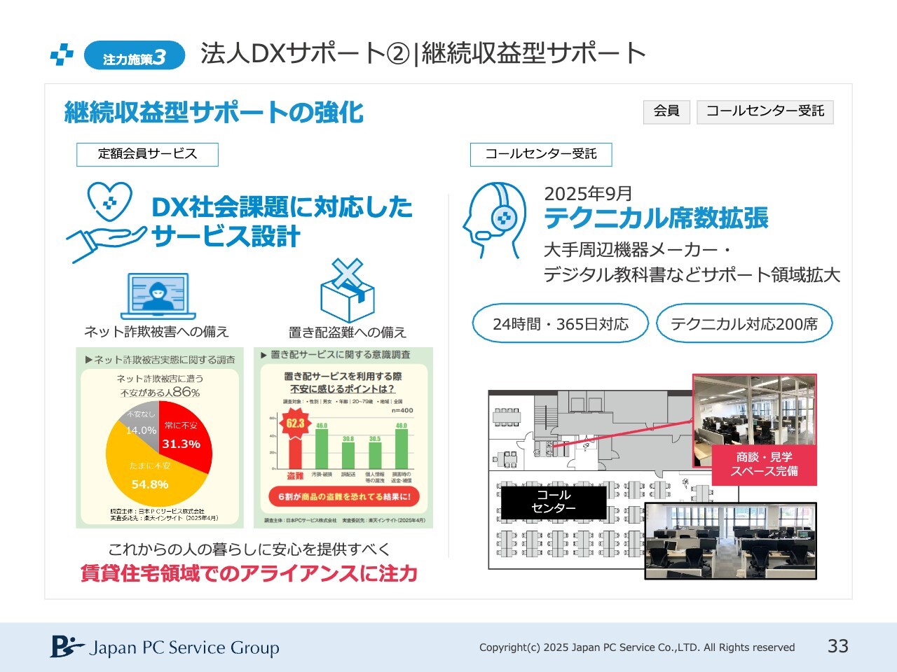 このようにサポートする領域が広がっていますので、テクニカルサポートの席数がないとコールセンターの受注は難しいため、席数をしっかり拡張しました。受注をしっかり進め、継続的な収益につなげていきたいと考えています。