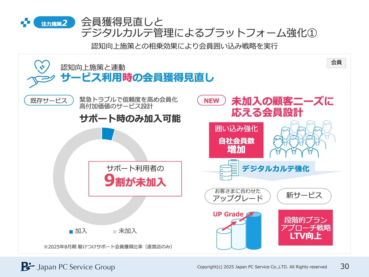 この中の25パーセントのお客さまにはリピートでご利用いただいていますが、リピートでご利用いただくまでには一定の期間待つ必要があります。そのため、未加入の9割のお客さまにも私たちの会員になっていただけるよう、囲い込みを強化しています。