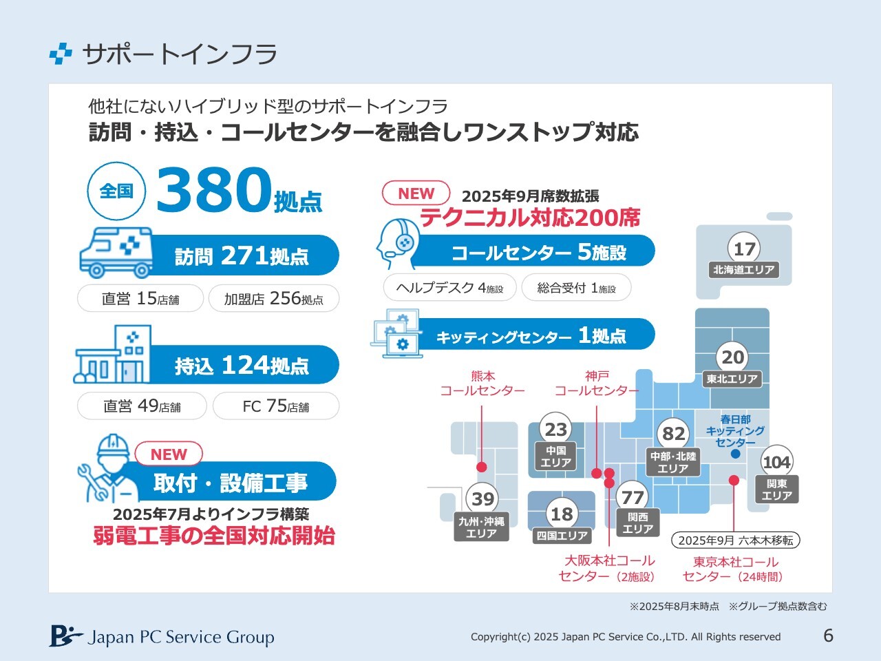 さらに、スライドに「NEW」と記載しているとおり、取付・設備工事として、弱電工事の全国対応をこの決算期から開始しました。新たな需要をしっかり取り込んでいきたいと考えています。
