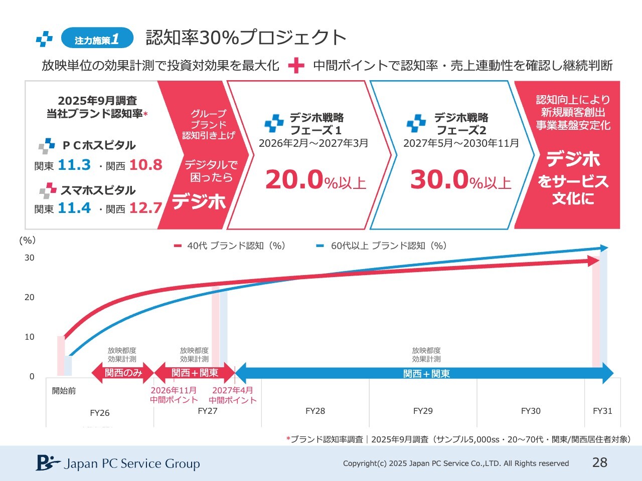 そのため、「認知率30%プロジェクト」に関しては、2026年2月から2027年3月までの間に認知率を20パーセントに、2027年5月から2030年11月までの間に認知率を30パーセントに引き上げることを目指し、取り組みを確実に進めていきたいと考えています。
