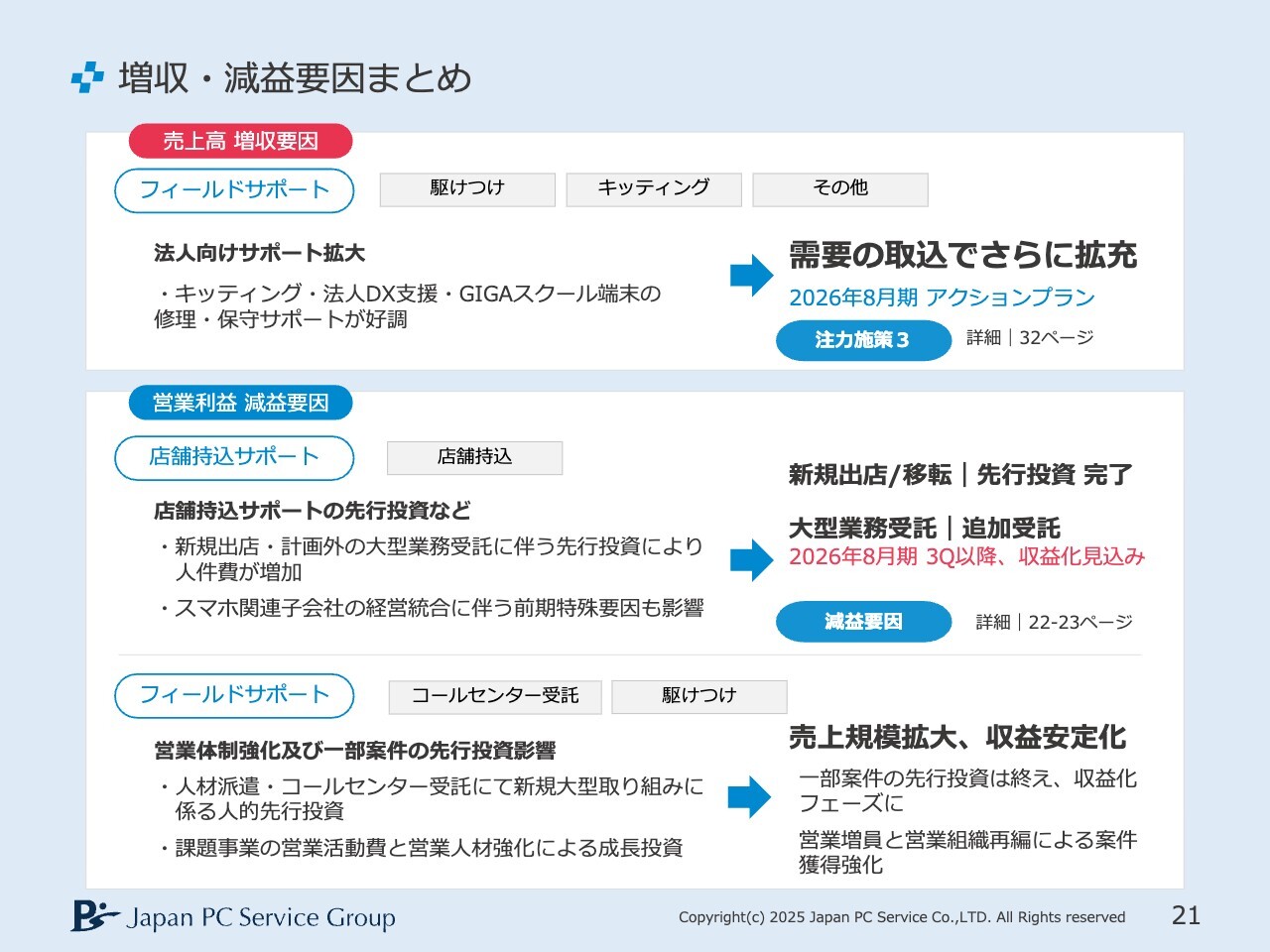 増収と減益の要因を簡単にまとめています。増収については、法人DXが順調に推移したことが要因です。これは進行期のアクションプランにも含めていますので、そちらであらためてご説明します。