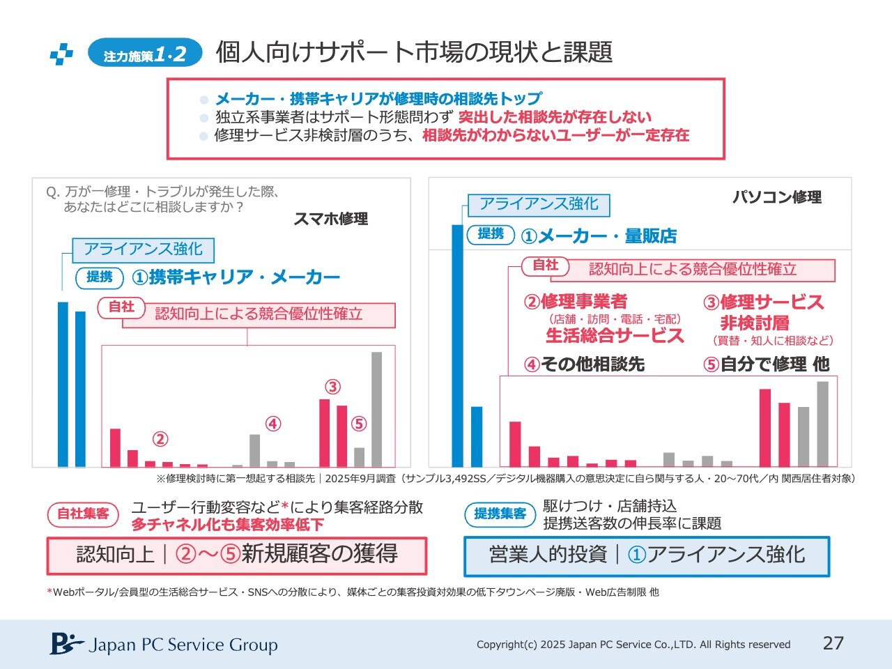 こちらのスライドは、個人向けサポート市場の現状を示しています。当社は長年、「万が一修理・トラブルが発生した際、あなたはどこに相談しますか?」という調査を実施しています。この9月にあらためて実施した結果、スマホ修理では携帯キャリアやメーカーが圧倒的に多く利用され、パソコン修理ではメーカーや量販店が主流であることがわかりました。