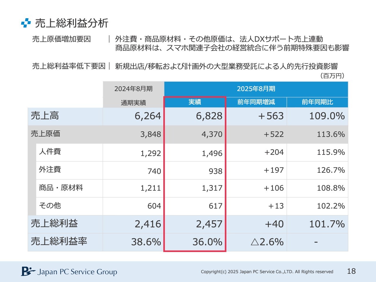 売上総利益率については、第2四半期時点でもご説明していた持込サポートの新規出店や移転、および大手通信会社からの大型業務受託が始まったことが影響しています。